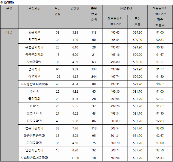 가군 의예 419, 약학 399, 반도체시스템공학 390, 글로벌경제 387, 경영 385, 인문과학계열 385, 나군 글로벌바이오메디컬공 390, 소프트웨어 389, 전자전기공학 388, 수학교육 386, 공학계열 385, 영상 382, 다군 반도체융합공학 390점 예상입니다.
