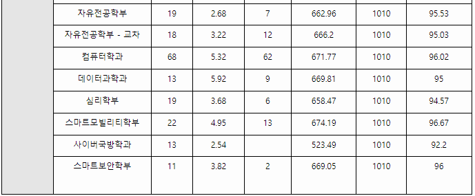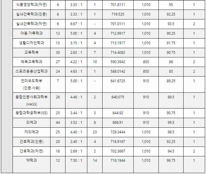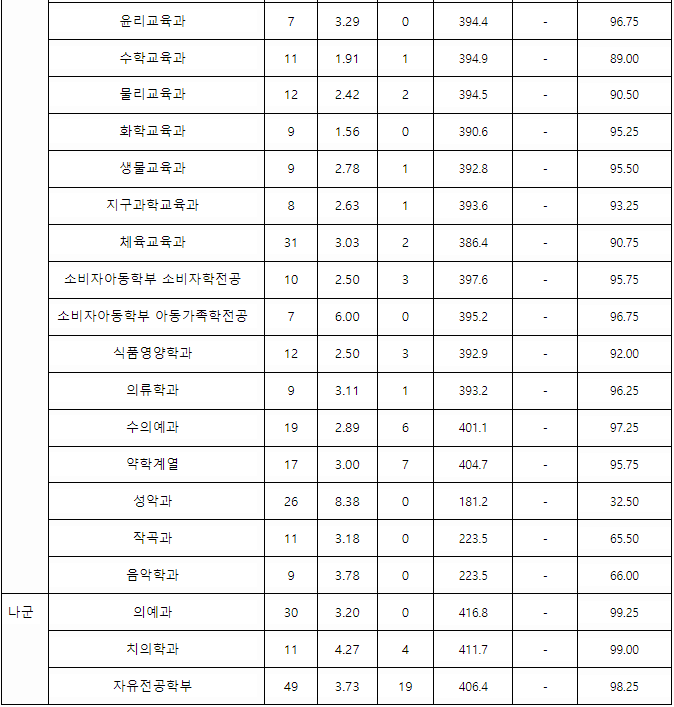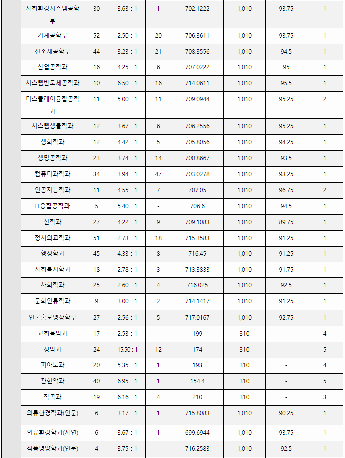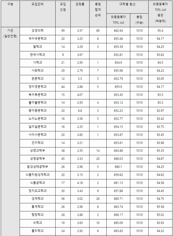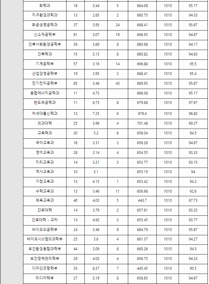 정시배치표 예상점수는 메가스터디 작성본 참고입니다. 의예 419, 치의학 408, 컴퓨터공 408, 전기전자정보공학 405, 재료공학 400, 천문 395, 바이오시스템 소재 391, 생물교육 390, 자유전공 408, 경영 402, 정치외교 401, 언론정보 400, 인문 398, 농경제사회 397, 국어교육 395, 역사교육 391점으로 예상합니다.