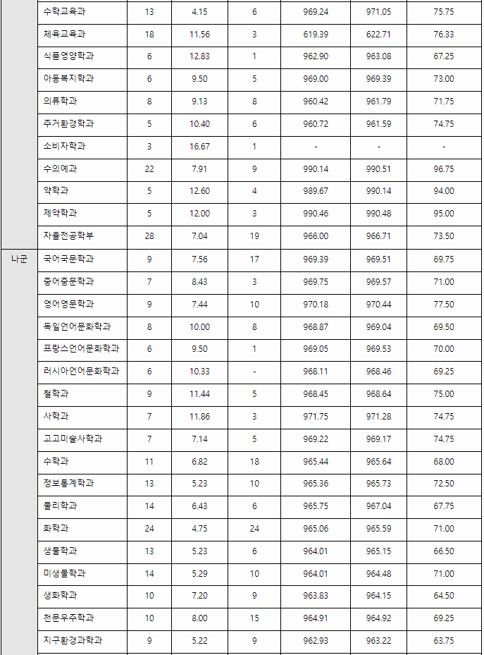 충북대 정시배치표 참고점수입니다. 가군 약학, 제약 395, 수의예 393, 윤리교육 371, 건축 363, 심리, 생물교육 358, 지리교육 352, 지구과학교육, 화학공학 351, 정치외교, 도시공학 347, 자율전공, 소비자 346, 아동복지, 기계공학 345, 경제, 행정 343, 영어교육 340, 토목공학, 바이오헬스 339, 나군 의예 407, 간호 363, 소프트웨어, 산림 360, 국제경영 357, 컴퓨터공학 355, 경영 350, 전자공학, 반도체공학 349, 바이오시스템공학 346, 경영정보 344, 식품생명공학 342, 농업경제, 목재종이과학 340, 국어국문 339, 러시아언어문화, 천문우주 338, 정보통신공학 334점으로 예상합니다.