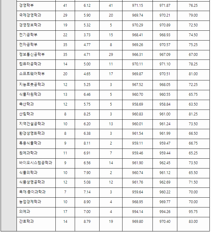 충남대 2023년도 정시전형결과입니다. 가군 의예 96.93, 수의예 94.7, 간호 79.5, 식물자원 73.75, 정보통계 75.88, 생화학 73.28, 수학 71, 생물환경화학 72.45, 경영 79, 경제 79.7, 국제 81.83, 언어 74.63, 무역 78.2, 나군 약학 93.7, 전자공학 81.1, 전기공학 80.3, 미생물분자생명과학 81.15, 컴퓨터융합 78.78, 건축학과 76.2, 영어교육 78.8, 정치외교 78.78, 심리 77.63, 사회 77.25, 공공안전학 76.98, 국어교육 78입니다.