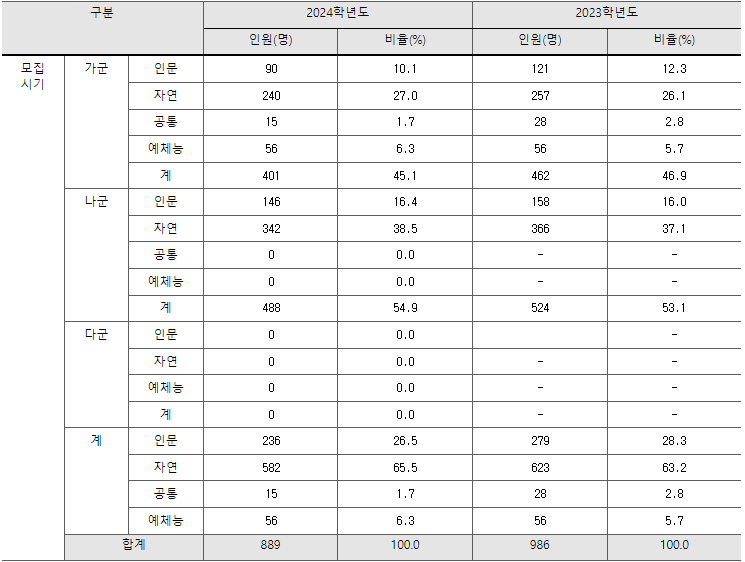 충북대 정시인원 모집은 2023년 986명보다 감소한 889명을 선발할 예정입니다. 인문 236, 자연 582, 예체능 56명입니다. 바이오헬스학부가 신설되었으며 전자공학과, 반도체공학부는 분리됐습니다. 국어, 수학, 탐구 표준점수를 활용합니다. 모집군은 가,나군입니다.