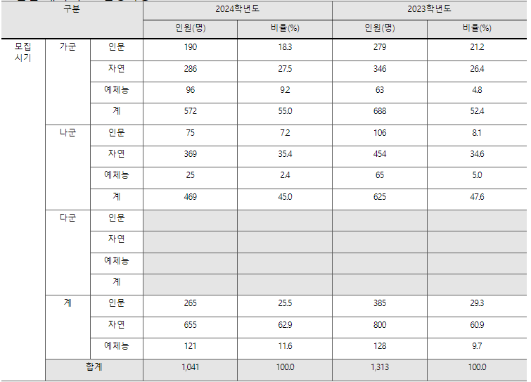 충남대 2024정시모집은 가,나군 인문 265, 자연 655, 예체능 121, 총 1,041명입니다. 탐구영역(사회/과학/직업) 수능반영방법이 변경되어 표준점수로 적용됩니다. 국어, 수학도 표준점수 적용입니다. 영어, 한국사는 취득 등급에 따라 감산 반영합니다.