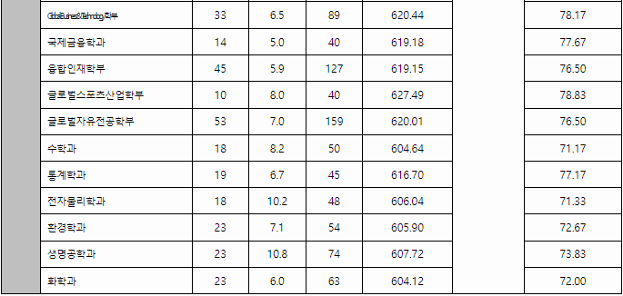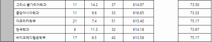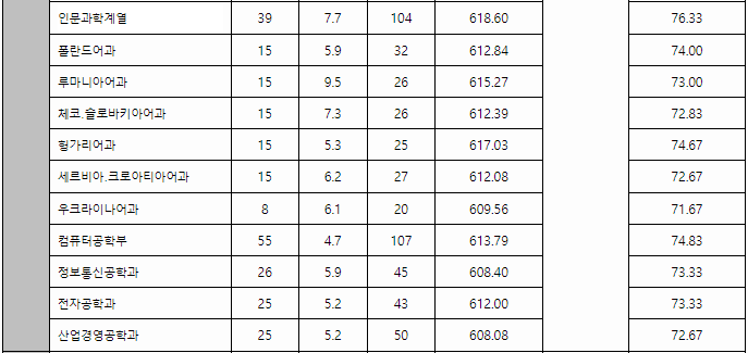 입시결과를 보면 가군 아프리카학부 75.17, 바이오메디컬공학부 75.17, 나군 인문과학계열 76.33, 헝가리어과 74.67, 컴퓨터공학 74.83, 전자공학 73.33, 다군 Global Business&Technology학부 78.17, 글로볼스포츠산업학부 78.83, 융합인재 76.50, 국제금융 77.67입니다.