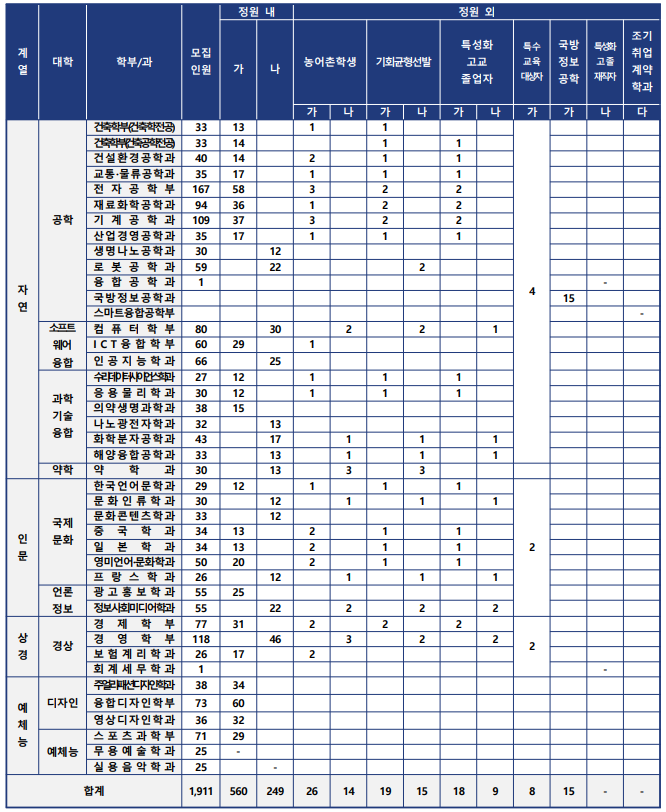 한양대 에리카 캠퍼스는 정시모집으로 인문 278, 자연 492, 예체능 155명으로 총 925명을 모집합니다. 가,나군 모집입니다. 수능 국어영역은 계열별 선택과목 제한 없으며, 수능 수학영역 자연계열은 선택과목에서 미적분 또는 기하 중 1과목 응시 필수, 교차지원가능학과, 인문·상경계열, 예체능계열은 선택과목 제한 없습니다.