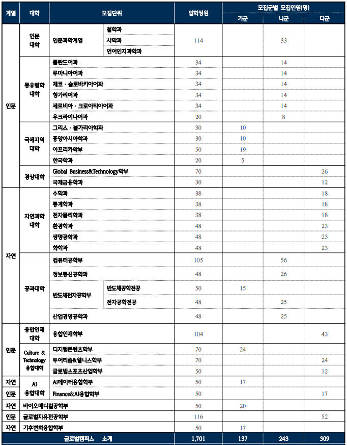 한국외대 글로벌캠퍼스도 서울 캠퍼스와 마찬가지로 가,나,다군으로 모집합니다. 일반전형 수능 100% 반영입니다. 선발인원은 709명입니다. 국어, 수학 영역은 모집단위별 반영 영역의 표준점수를 반영합니다. 영어 영역은 등급에 따른 환산 점수를 반영합니다.