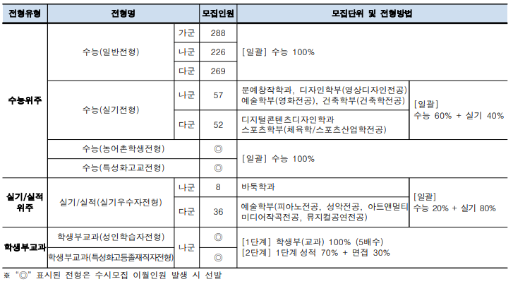 광운대는 가군 293명, 나군 108명, 다군 422명으로 823명을 모집합니다. 탐구영역은 수능 백분위 발표 후 이를 활용하여 본교에서 자체 산출한 변환표준점수를 적용하며, 국어, 수학은 표준점수 활용입니다. 원서 접수는 2024. 1. 3.(수) 10:00 ~ 1. 6.(토) 17:00까지입니다.