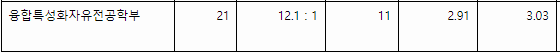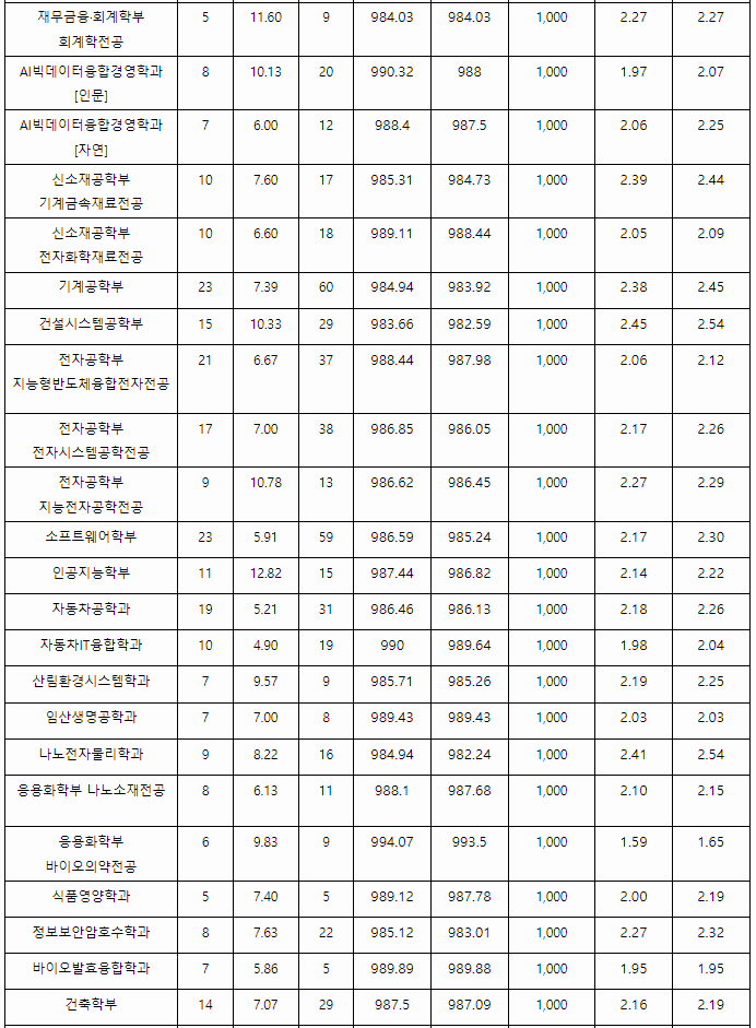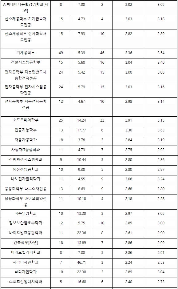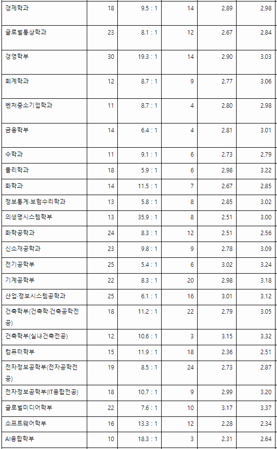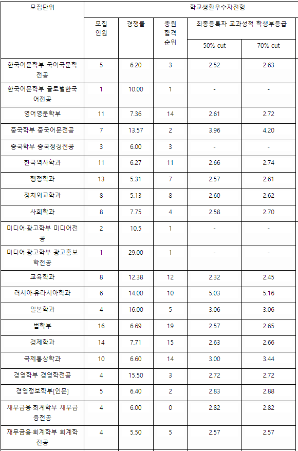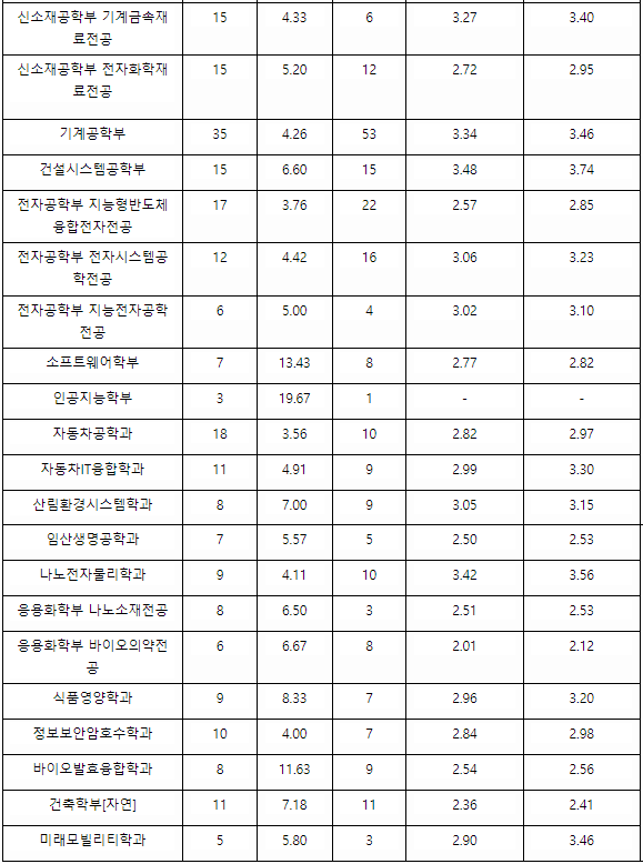 국민대 학생부종합 결과입니다. 먼저 국민프런티어 전형입니다. 한국역사 2.83, 정치외교 2.64, 교육 2.70, 법학부 2.89, 경제 2.88, 경영정보학부(인문) 2.74, 기계공학 3.54, 소프트웨어 3.15, 자동차공학 3.19, 자동차IT융합 2.92, 응용화학부 나노소재전공 2.80, 바이오발효융합학과 2.90, 건축학부(자연)2.99, AI디자인 3.04, 스포츠산업레저 2.73입니다. 학교생활우수자전형 결과를 보면 영어영문학부 2.72, 행정 2.61, 사회 2.70, 교육 2.45, 경제 2.66, 국제통상 3.44, 회계학전공 2.57, 건설시스템공학 3.74, 소프트웨어 2.82, 임산생명공학 2.53, 응용화학부 바이오의약전공 2.12, 건축학부(자연)2.41입니다.