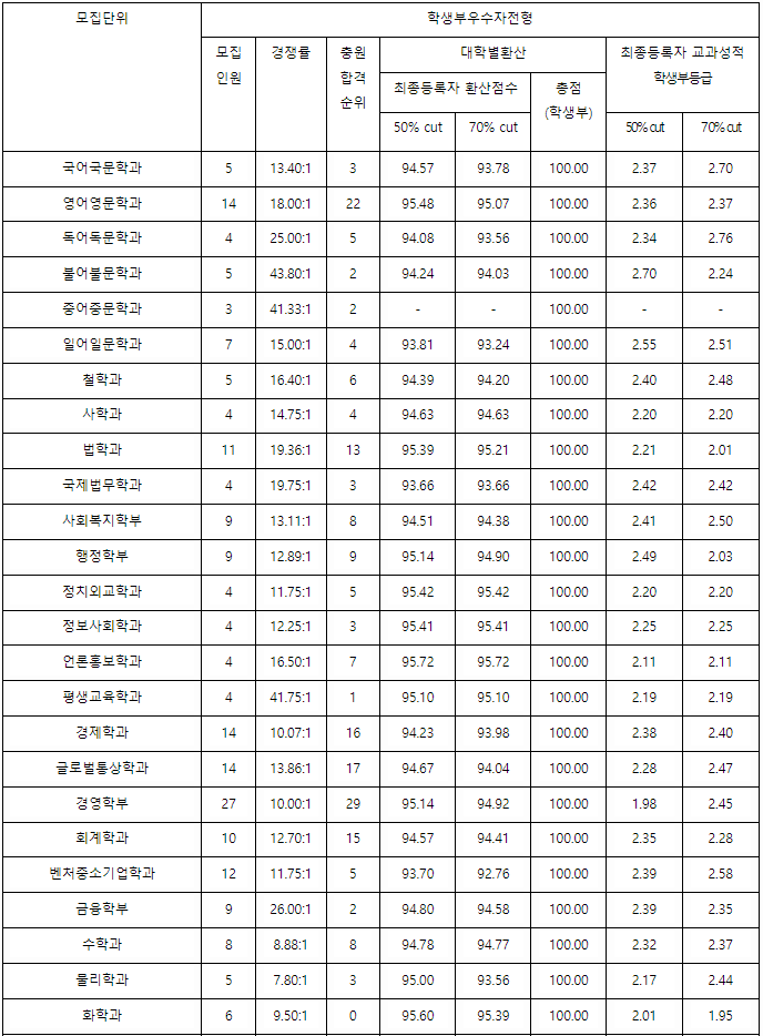 학생부 교과 성적 전형인 학생부우수자전형은 435명을 선발합니다. 학생부 교과 성적 100%를 반영하며 공통과목·일반선택 80%, 진로선택과목 20%로 반영합니다. 논술우수자전형은 267명을 선발하며, 논술 60%, 학생부교과 40%를 반영합니다. 학생부우수자전형, 논술우수자전형은 수능 최저학력기준을 충족해야 합니다. 인문·경상계열은 4개(국어·수학·영어·탐구(1과목)) 영역 중 2개 합이 4등급 이내, 자연계열은 4개 영역(국어·수학·영어·탐구(1과목)) 중 2개 합이 5등급 이내, 융합특성화자유전공학부는 4개 영역(국어·수학·영어·탐구(1과목)) 중 2개 합이 5등급 이내입니다. 숭실대 수시모집 원서접수는 9월 12일~15일입니다.
