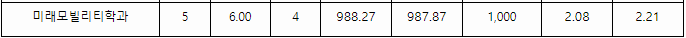 학생부종합(SSU미래전형)결과입니다. 영어영문 3.42, 일어일문 3.87, 철학 3.23, 국제법무 2.67, 행정 2.98, 정치외교 3.13, 글로벌통상 2.84, 경영 3.03, 수학 2.79, 화학 2.85, 화학공학 2.56, 신소재공학 3.09, 기계공학 3.18, 건축학부(실내건축전공) 3.32, 컴퓨터학부 2.51, 글로벌미디어 3.37, 소프트웨어 2.34, AI융합학부 2.64입니다.
