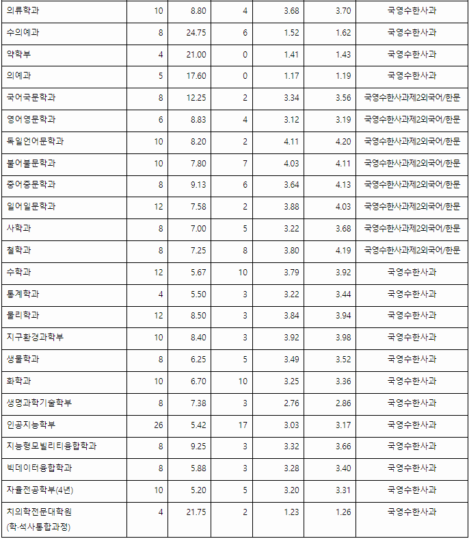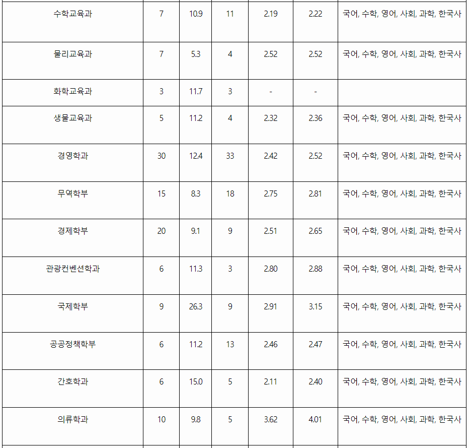 학생부 종합 결과입니다. 영어영문 2.54, 사학 2.78, 사회복지 2.28, 수학 2.92, 화학 2.47, 분자생물 2.57, 해양 4.10, 기계공학 2.53, 재료공학 2.62, 전자공학 2.27, 항공우주공학 2.79, 영어교육 2.43, 교육 2.57, 경영 2.52, 무역 2.81, 국제 3.15, 동물생명자원과학 3.95, 광메카트로닉스공학 3.21, 의생명융합공학 2.36입니다.