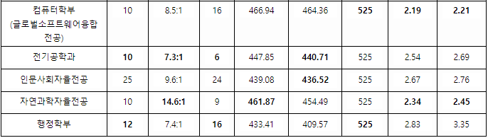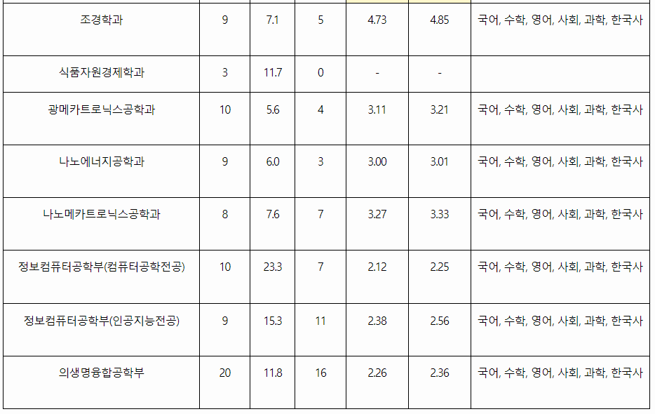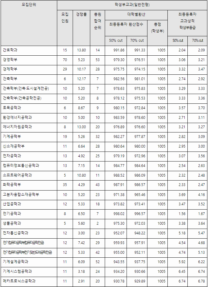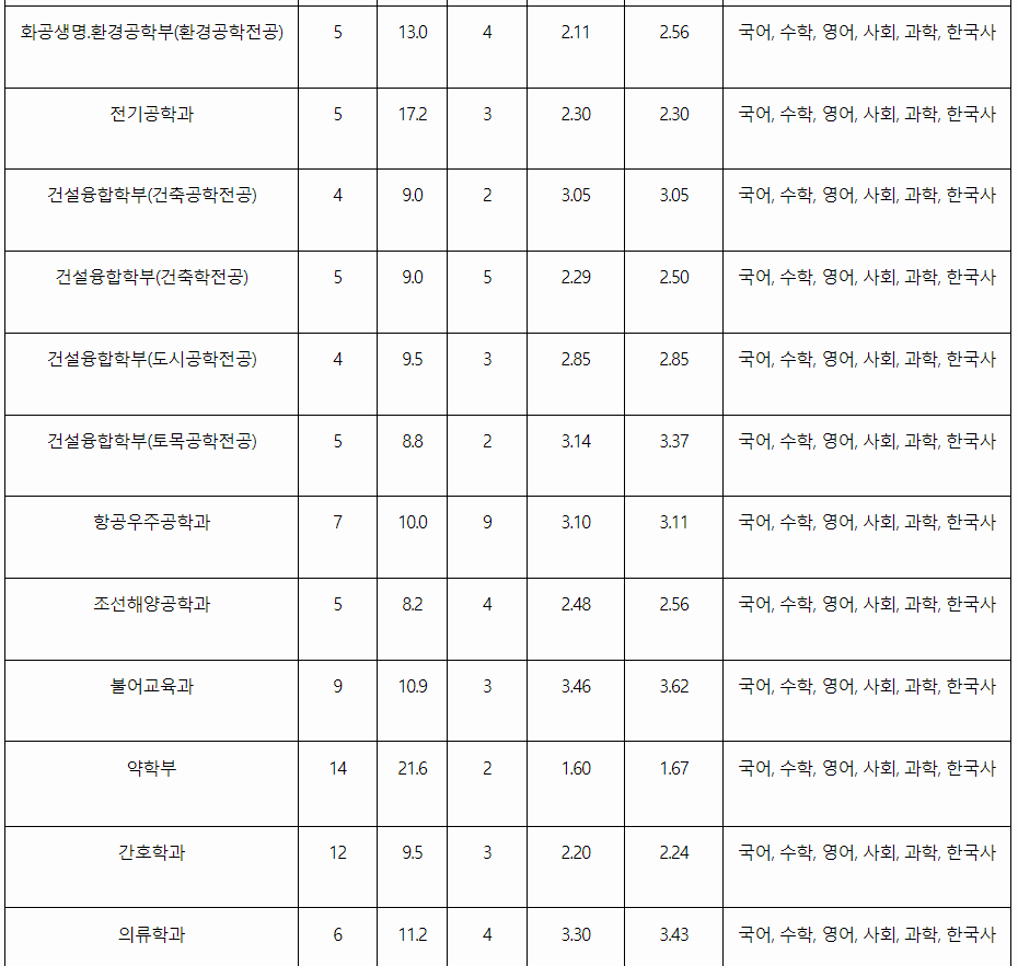 학생부 종합 결과입니다. 영어영문 2.54, 사학 2.78, 사회복지 2.28, 수학 2.92, 화학 2.47, 분자생물 2.57, 해양 4.10, 기계공학 2.53, 재료공학 2.62, 전자공학 2.27, 항공우주공학 2.79, 영어교육 2.43, 교육 2.57, 경영 2.52, 무역 2.81, 국제 3.15, 동물생명자원과학 3.95, 광메카트로닉스공학 3.21, 의생명융합공학 2.36입니다.