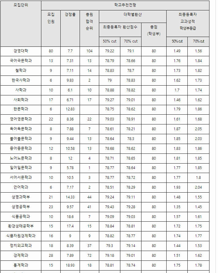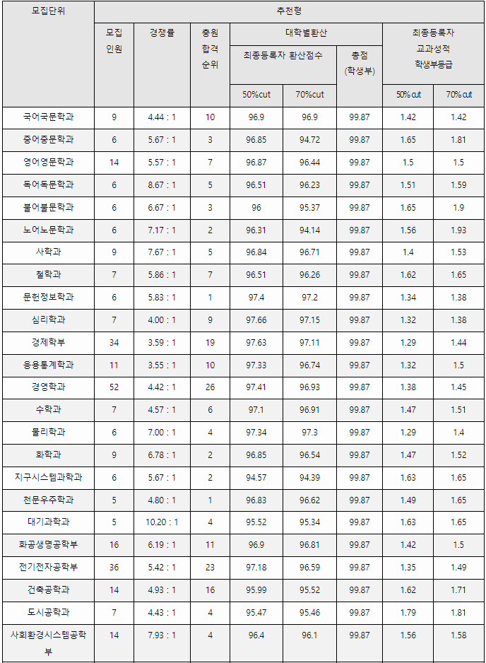 학생부교과전형(추천형) 결과입니다. 영어영문 1.5, 노어노문 1.93, 철학 1.65, 문헌정보 1.38, 경제 1.44, 경영 1.45, 물리 1.4, 천문우주 1.65, 화공생명공학 1.5, 전기전자공학 1.49, 도시공학 1.81, 기계공학 1.54, 산업공학 1.7, 생명공학 1.46, 컴퓨터과학 1.22, 정치외교 1.34, 행정 1.39, 문화인류 1.37, 식품영양 1.97, 생활디자인 1.45, 교육 1.34, 의예 1.04, 치의예 1.14, 간호 1.7, 약학 1.16입니다.