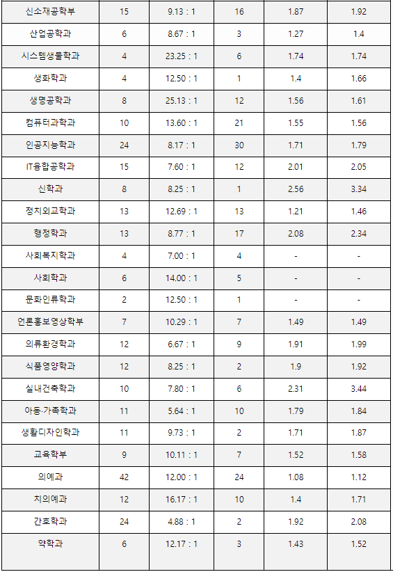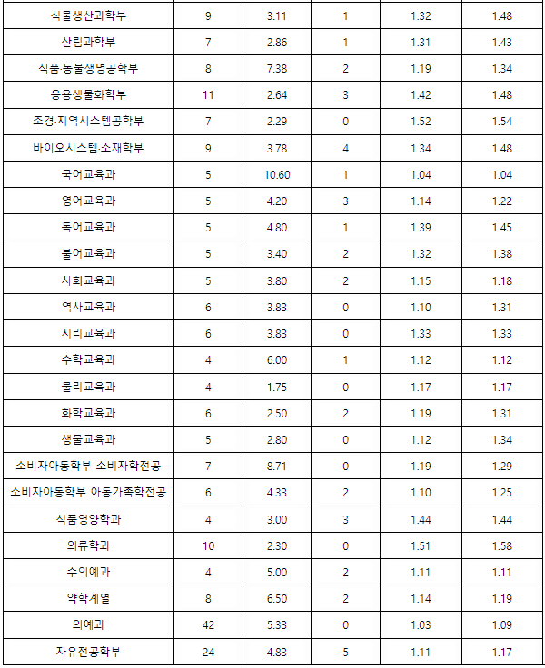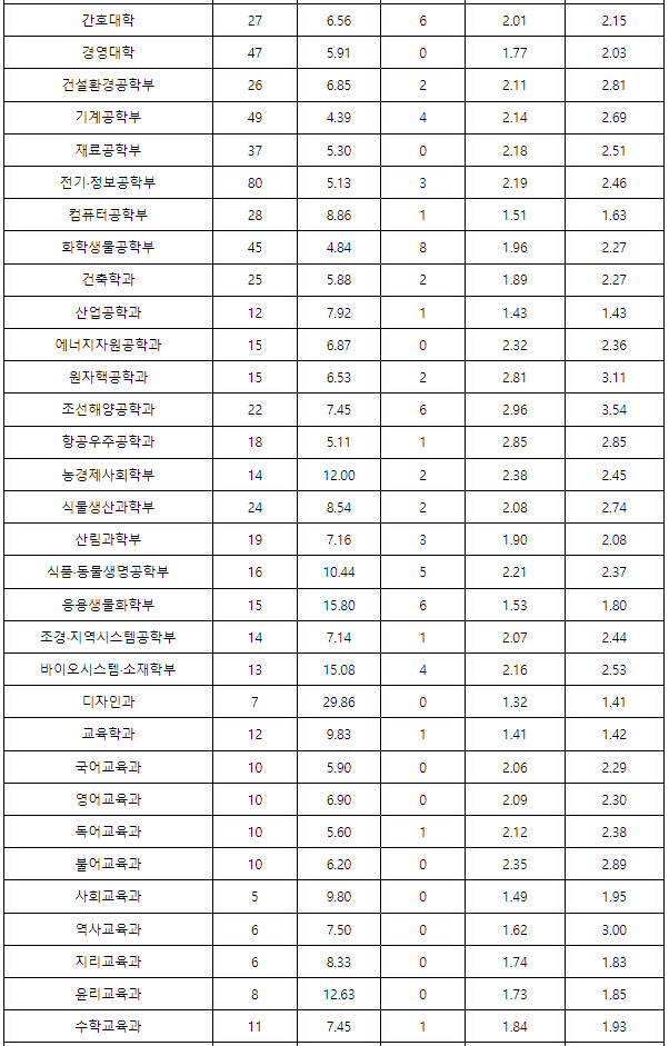 학생부종합 일반전형 결과입니다. 국어국문 2.66, 언어 2.26, 역사 2.73, 미학 2.35, 경제 2.25, 사회 2.27, 심리 2.36, 언론정보 1.86, 통계 2.15, 화학 2.53, 간호 2.15, 경영대학 2.03, 컴퓨터공학 1.63, 산업공학 1.43, 농경제사회 2.45, 응용생물화학 1.80, 디자인 1.41, 교육 1.42, 사회교육 1.95, 윤리교육 1.85, 체육교육 3.85, 식품영양 1.83, 의류 2.04, 수의예 1.98, 약학 1.56, 의예 1.28, 치의예 1.64입니다. 상세한 내용은 표를 참고하시기 바랍니다. 모든 자료는 대입정보포털 어디가가 출처입니다.