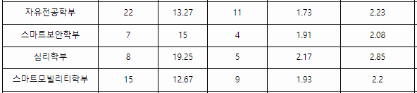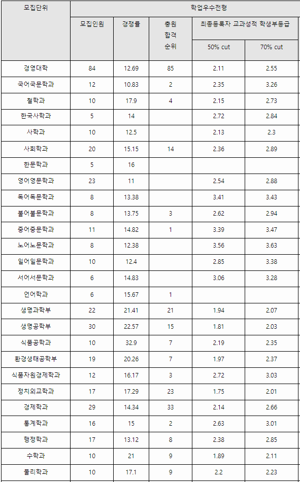 학생부종합전형(학업우수전형)입결입니다. 경영대학 2.55, 사학 2.3, 독어독문 3.43, 생명과학 2.07, 식품공학 2.35, 정치외교 2.01, 경제 2.66, 행정 2.85, 수학 2.11, 화학 2.02, 지구환경과학 2.25, 건축 2.25, 기계공학 2.15, 반도체공학 1.89, 의과대학 1.66, 교육 2.2, 국어교육 2.28, 간호대학 2.18, 컴퓨터학과 1.63, 미디어학부 1.91, 바이오의공학 2.34, 자유전공 2.23, 스마트모빌리티 2.2입니다.
