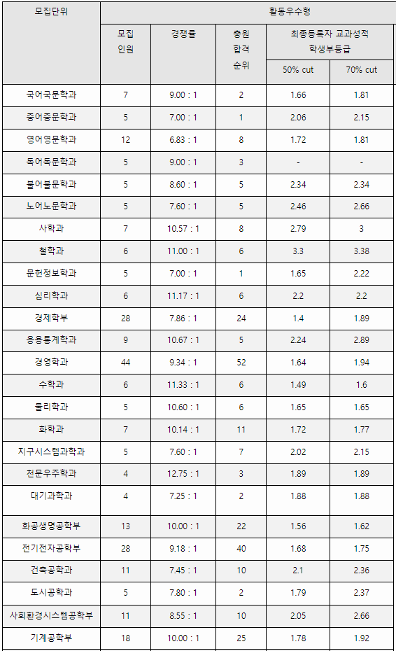 학생부종합전형(활동우수형) 결과입니다. 국어국문 1.81, 영어영문 1.81, 문헌정보 2.22, 경제 1.89, 경영 1.94, 수학 1.6, 물리 1.65, 천문우주 1.89, 전기전자공학 1.75, 기계공학 1.92, 산업공학 1.4, 생명공학 1.61, 정치외교 1.46, 식품영양 1.92, 생활디자인 1.87, 교육 1.58, 의예 1.12, 치의예 1.71, 간호 2.08, 약학 1.52입니다. 학생부 종합전형 기회균형Ⅰ에서는 경제 1.5, 경영 1.75, 전기전자공학 1.73, 기계공학 1.87, 기회균형 Ⅱ 경영 1.43입니다.