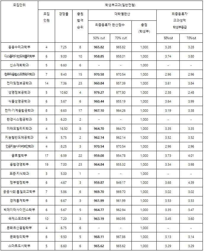 학생부종합 전형 최종등록자 70% 수시등급컷입니다. 건축학 4.33, 건축공학 3.77, 전자공학 3.73, 기계공학 3.82, 컴퓨터공학 3.32, 인공지능 3.20, 약학 2.95, 응용물리 3.87, 의약생명과학 3.12, 해양융합공학 3.22, 문화인류 4.79, 프랑스학과 4.75, 광고홍보 3.30, 경제 4.12, 경영 3.65, 커뮤니케이션디자인 3.11입니다.