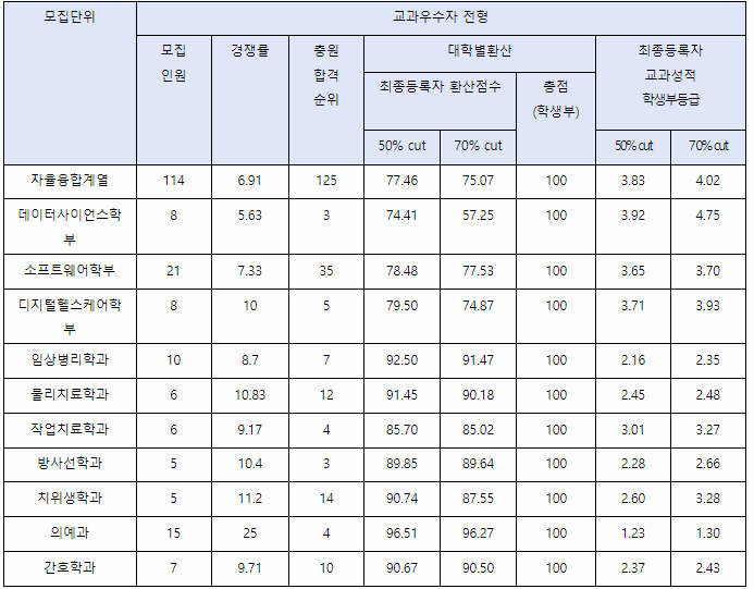 교과우수자전형 입결입니다. 최종등록자 교과등급 70%컷입니다. 자율융합계열 4.02, 소프트웨어학부 3.70, 임상병리 2.35, 물리치료 2.48, 방사선 2.66, 치위생 3.28, 의예 1.30, 간호 2.43입니다.