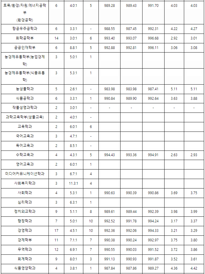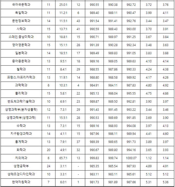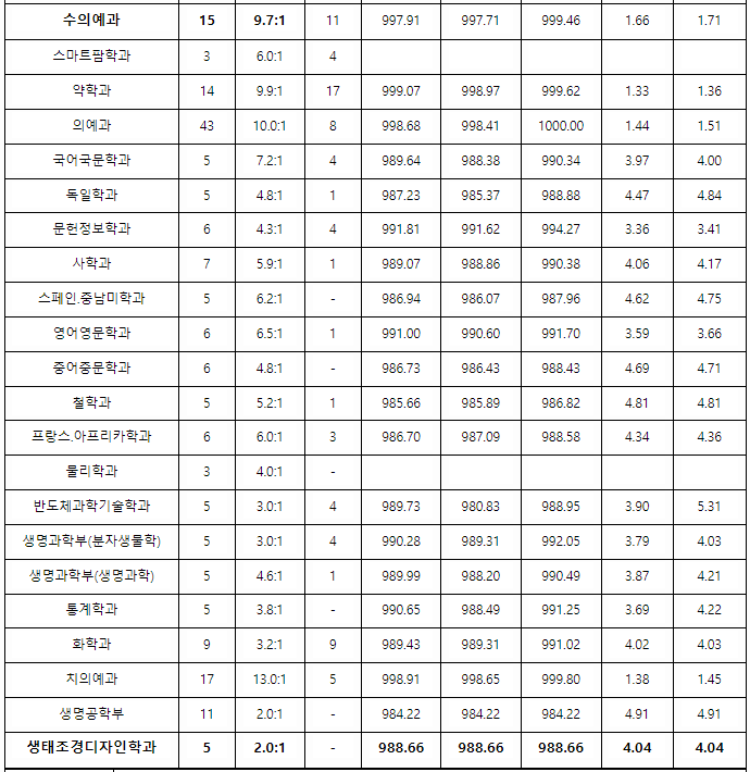 학생부종합전형 결과입니다. 국어국문 3.93, 사학 3.53, 심리 3.32, 행정 3.29, 정치외교 3.33, 경제 3.62, 화학 3.20, 생물 3.19, 생화학 2.92, 경영 3.35, 화학공학 3.04, 전자공학 3.59, 컴퓨터공학 3.02, 식품생명공학 3.77, 교육 2.79, 영어교육 2.51, 생물교육 2.73, 수의예 1.40, 의예 1.08, 간호 2.39입니다.