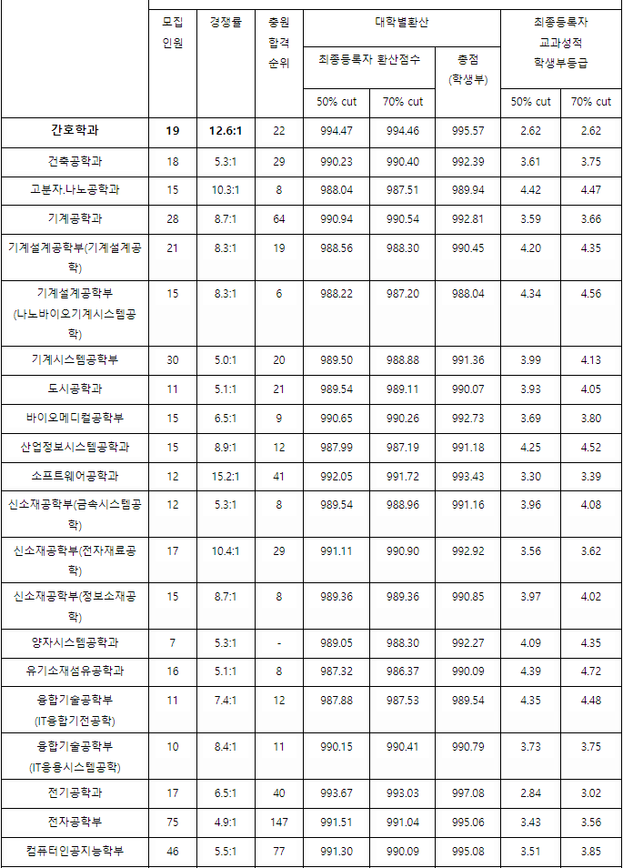 충남대 학생부교과 일반전형 결과입니다. 국어국문 3.25, 사회학 3.18, 문헌정보 2.96, 심리 2.54, 언론정보 2.55, 정치외교 2.92, 경영 2.85, 국제학부 3.20, 정보통계 3.51, 생화학 2.79, 건축 3.22, 기계공학 3.10, 전기공학 3.01, 전자공학 2.51, 컴퓨터융합 2.74, 인공지능공학 2.85, 약학 1.46, 의예 1.13, 수의예 1.47, 간호 2.27 입니다.