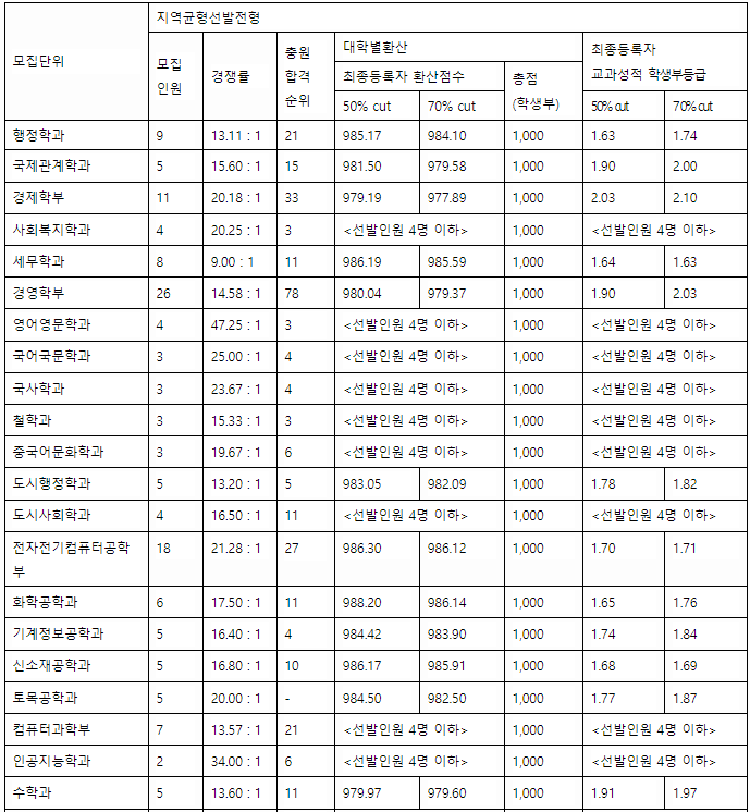 서울시립대 학생부교과전형(지역균형선발전형) 결과입니다. 최종 등록자 교과 성적 70%컷입니다. 행정 1.74, 세무 1.63, 도시행정 1.82, 화학공학 1.76, 토목공학 1.87, 수학 1.97, 환경공학 1.78입니다. 학생부종합 전형 결과를 보면, 국제관계 2.21, 경제 4.02, 세무 2.75, 국사 2.54, 도시사회 2.29, 화학공학 2.07, 신소재공학 2.17, 컴퓨터과학 2.14, 생명과학 2.10, 도시공학 2.17, 환경공학 2.15입니다.