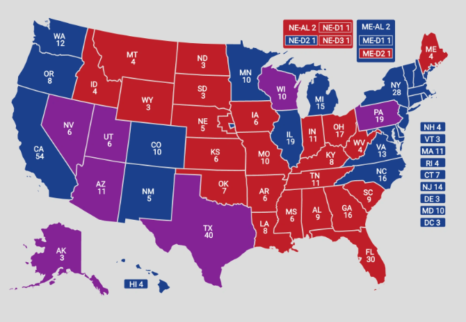 미국 대선은 간접 선거로 대통령을 선출합니다. 승자는 전국에서 가장 많은 표를 얻은 사람이 아닙니다. 50개 주는 인구에 따라 부분적으로 결정되는 소위 선거인단 투표의 수를 가지고 있습니다. 총 538명이 경쟁하며, 270명 이상을 이긴 후보가 승리합니다. 두 주를 제외한 모든 주는 승자 독식 규칙을 따르므로 가장 많은 표를 얻은 후보가 해당 주의 모든 선거인단 표를 차지합니다. 대부분의 주는 특정당에 크게 기울어 있기 때문에 초점은 보통 두 당 중 어느 한 당이 이길 수 있는 12개 정도의 주에 맞춰집니다. 이를 Swing state라고 합니다. 2016년 힐러리가 그랬던 것처럼 후보가 전국적으로 가장 많은 표를 얻을 수도 있으나, 선거인단에 의해 패배할 수도 있는 것이 미국 대통령 선거입니다. 스윙 스테이트는 미국에서 공화당과 민주당 후보가 비슷한 수준의 지지를 받고 대선 결과에 중요한 역할을 할 것으로 여겨지는 특정 주를 말합니다. 특정 정당에 대한 지지가 명확하지 않기 때문에 선거 결과를 예측하기가 어렵습니다. 파란색과 빨간색이 섞인 보라색 주라고도 불립니다. 이들 주는 선거마다 공화당 민주당을 교차하여 지지하는 경향이 있어 선거 결과에 큰 영향을 줍니다. 이들 주는 선거에서 중요한 전략적 가치를 지니며, 후보자들은 유권자들을 설득하는 데 많은 시간과 자원을 투입합니다. 스윙 스테이트는 지지 정당이 바뀌기도 하는데 대표적인 스윙 스테이트였던 플로리다와 오하이오는 이제 공화당 약체 지역으로 분류되고 애리조나와 네바다, 미시간은 최근 스윙 스테이트로 분류되고 있습니다. 민주당의 우세 지역이 더 이상 아닙니다.