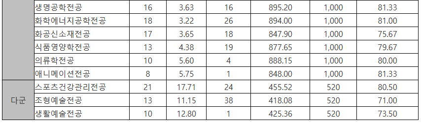 광운대는 국어, 수학 표준점수, 탐구과목 변환표준점수를 적용합니다. 인문계 수능영역 반영 비율은 국25,수25,영25,탐25, 자연계 국20,수35,영20,탐25를 반영합니다. 인문계는 나,다군, 자연계는 가,다군으로 모집합니다.