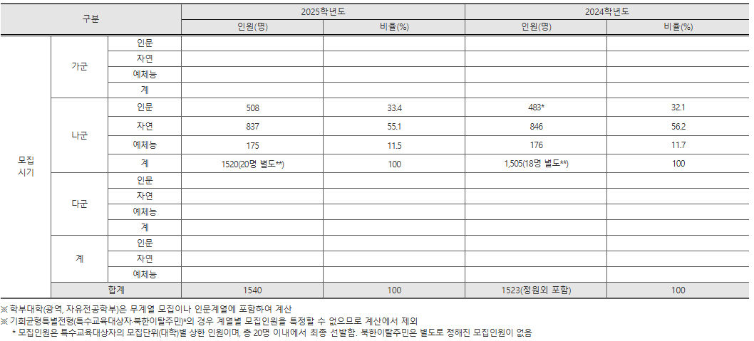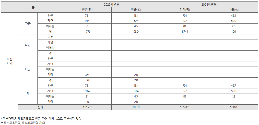 고려대학교는 가군, 다군(예체능)으로 1,812명을 모집합니다. 원서 접수 일정은 12월 31일~1월 2일까지입니다. 국어, 수학은 표준점수, 탐구는 자체 변환점수를 적용합니다.