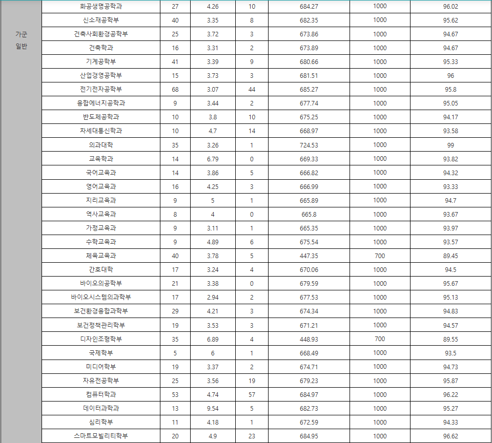 2024학년도 입시 결과입니다. 백분위 점수입니다. 경영대학 95, 국어국문 93.78, 사학 94.43, 불어불문 94, 생명과학 95.33, 식품공학 94.67, 정치외교 94.45, 경제 95.23, 통계 95.23, 물리 95.53, 신소재공학 95.62, 기계공학 95.33, 전기전자공학 95.8, 반도체공학 94.17, 의과대학 99, 교육 93.82, 수학교육 93.57, 간호대학 94.5, 자유전공 95.87, 사이버국방 92.93입니다.