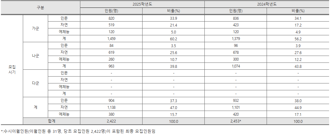 경희대는 가,나군으로 2,422명을 모집합니다. 수능 성적은 표준점수를 활용하며 영어 등급, 탐구 과목 백분위 활용 자체 변환표준점수를 반영합니다. 원서 접수 마감은 1월 3일 18시까지입니다. 인문계열은 국어 35%, 수학 20%, 탐구 30%, 자연계열은 국어 20%, 수학 35%, 탐구 30% 반영입니다.