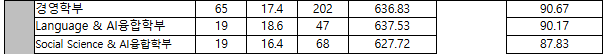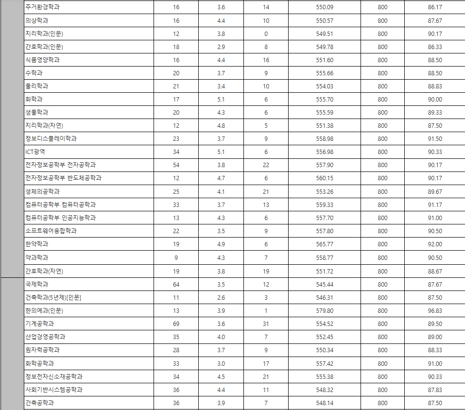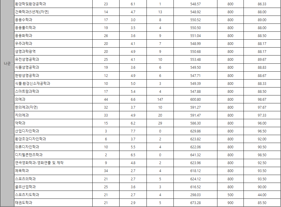 경희대 2024년 정시입시결과입니다. 국어국문 87.17, 사학 88.33, 글로벌커뮤니케이션 86.50, 자율전공 90.17, 행정 89.17, 경제 89.83, 경영 90.50, 빅데이터응용 91.17, 의상 87.67, 간호(인문)86.33, 수학 88.50, 화학 90.00, 정보디스플레이 91.50, 전자정보공학부 반도체공학 90.17, 소프트웨어융합 90.50, 한약 92.00, 약과학 90.50, 국제 87.50, 한의예(인문) 96.83, 기계공학 89.50, 화학공학 91.00, 우주과학 88.17, 의예 98.67, 치의예 97.33, 약학 96.00, 디지털콘텐츠 98.50, 스포츠의학 93.50입니다.