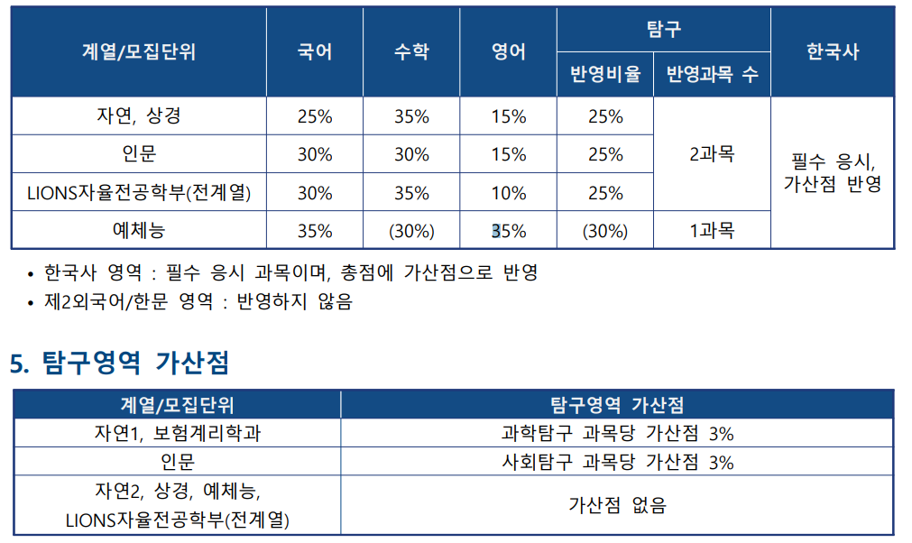 한국외대 글로벌 캠퍼스는 가나다군 모집으로 1,701명을 선발합니다. 모집단위별 수능 영역별 반영 비율 및 배점을 보면 인문계열 국30,수30,영20,탐20, 자연계열 국20,수35,영15,탐30입니다. 표준점수(국어, 수학), 변환표준점수(탐구)를 활용합니다.