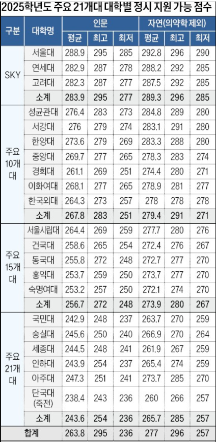 일단 현재 수능 원점수 기준으로 SKY(서연고) 인문계열 정시 지원 가능 점수는 최고 287점에서 최저 265점, 서강대, 성균관대, 한양대, 중앙대, 경희대, 이화여대, 한국외대 라인(주요 10개대)은 270~245점대, 서울시립대, 건국대, 동국대, 홍익대, 숙명여대 라인(주요 15개대)은 260점~235점대로 추정됩니다. 자연계열은 SKY권 자연계열 학과 정시 지원 가능 점수는 의약학 계열 학과를 제외하고 최고 280점에서 최저 265점, SKY제외 주요 10개대는 최고 270점에서 최저 255점, 주요 15개대는 최고 260점에서 최저 235점 정도로 예상합니다.
