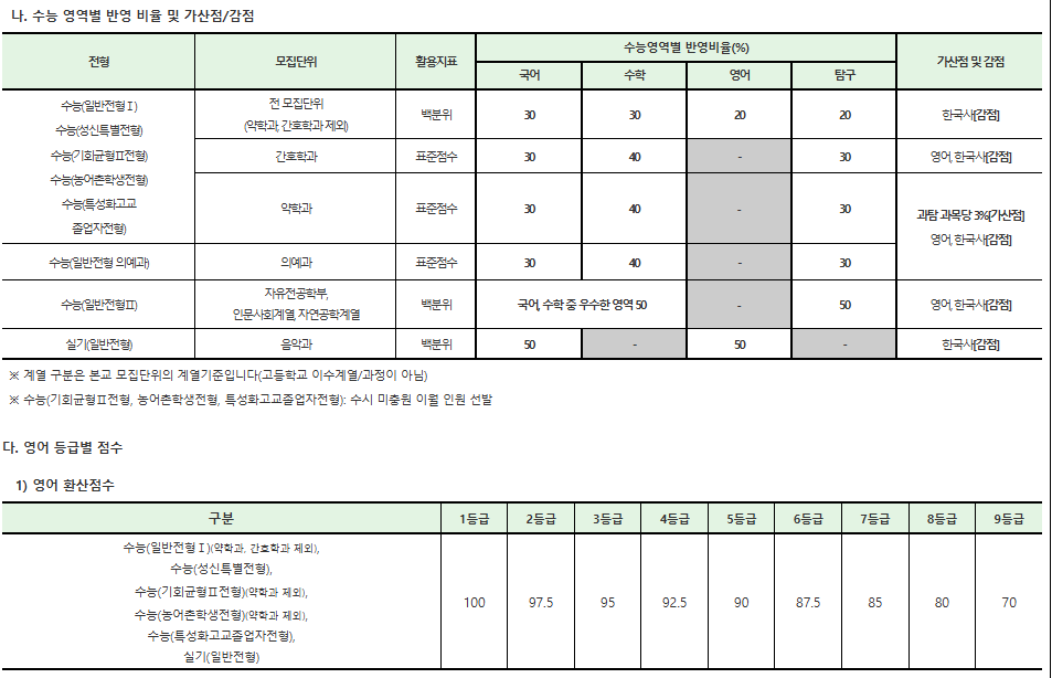 가톨릭대학교의 2026학년도 정시모집은 수능 중심의 일괄합산 선발 구조를 유지하면서도, 전형군별 모집인원 변동이 크게 나타난 것이 특징입니다. 전체 모집인원은 전년도 1,795명에서 1,845명으로 50명 증가했지만, 정시 비중은 585명에서 562명으로 다소 줄었습니다. 다만 정시 내부에서 군별 구조는 뚜렷하게 재편되었습니다. 가군은 267명에서 307명으로 40명 증가해 선발 비중이 14.87%에서 16.64%로 확대되었고, 나군은 191명에서 138명으로 53명 감소해 비중이 7.48%까지 줄었습니다. 다군 역시 127명에서 117명으로 10명 감소하며 축소 기조가 이어졌습니다. 이로 인해 2026학년도 정시는 가군 중심 선발이 강화되고, 나군·다군은 경쟁률이 전년도보다 다소 높아질 가능성이 있습니다. 전형 방식은 기본적으로 수능 100% 반영이며, 국어·수학·탐구·영어·한국사 성적을 활용해 자체 환산 점수를 산출합니다. 일부 모집단위는 영역별 반영비율이 다르며, 이공·보건계열에서는 수학 선택과목과 탐구 영역의 반영 방식이 당락에 큰 영향을 미칩니다. 특히 의예과는 수능 95%에 면접 5%를 더해 선발하는 유일한 전형이며, 예체능 계열은 실기 70%와 수능 30%를 반영합니다. 2025학년도 정시 입결을 보면 의예·약학·간호 등 최상위 학과는 높은 점수대를 유지했고, 중위권 학과는 군별 충원 변동에 따라 합격선의 편차가 컸습니다.