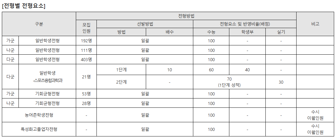 정시모집은 가군 192명, 나군 111명, 다군 403명을 선발하며, 원서 접수는 2025년 12월 29일부터 12월 31일, 최초합격자 발표는 2026년 2월 2일, 등록기간은 2월 3일부터 2월 5일까지입니다. 충원합격 발표는 2월 5일부터 2월 12일까지 진행됩니다.