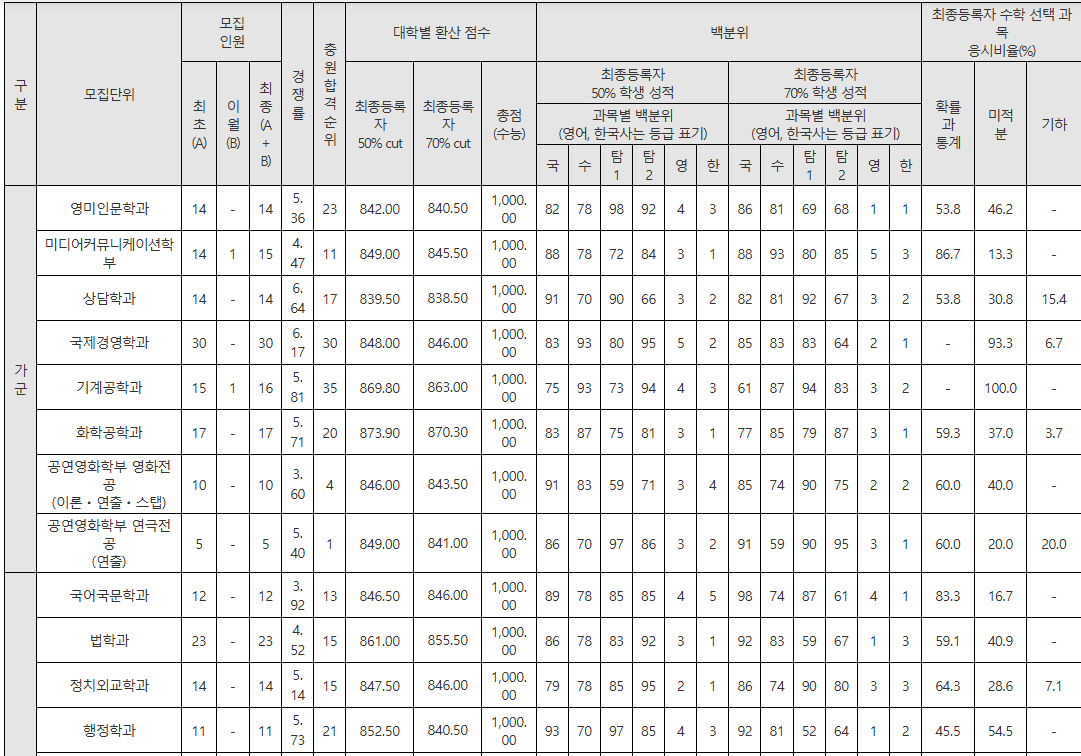 최종등록자 백분위 70%컷입니다. 미디어커뮤니케이션학부 87.83, 퇴계혁신칼리지 83.17, 국어국문학과 82.00, 사회계열광역 82.00, 정치외교학과 81.67, 경제학과 81.50, 철학과 81.33, 경영학부 81.33, 상담학과 80.83, 도시계획부동산학부 80.83, 전자전기공학과 84.67, 사이버보안학과 83.83, 수학교육과 83.83, 융합반도체공학과 83.00, 건축학전공 82.83, 화학공학과 81.67, 컴퓨터공학과 81.67, 모바일시스템공학과 81.67, 건축공학전공 81.00, 소프트웨어학과 80.83입니다.