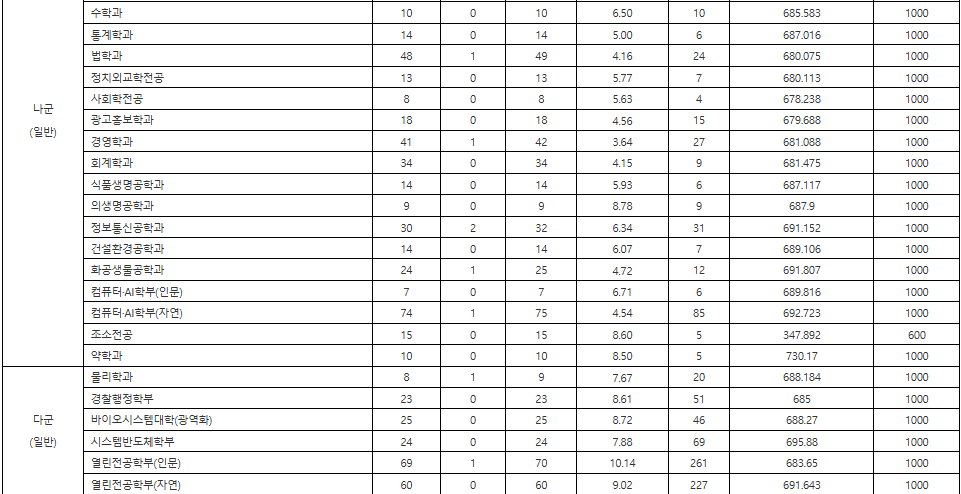 주요 학과 70%컷입니다. 동국대는 자체 발표점수입니다. 인문사회계열 경찰행정학부, 685.00,회계학과, 681.48,경영정보학과,681.25,미디어커뮤니케이션학전공,681.18,경제학과 ,681.10,경영학과,681.09,철학과,680.33,정치외교학전공,680.11,법학과,680.08,국제통상학과,679.74입니다. 인문사회계열 합격선은 대략 2등급 초반~중반대입니다. 자연이공계열을 살펴 보겠습니다. 약학과,730.17,시스템반도체학부,695.88,전자전기공학부,693.07,컴퓨터·AI학부(자연),692.72,에너지신소재공학과,692.15,화공생물공학과,691.81,기계로봇에너지공학과,691.15,정보통신공학과,691.15,컴퓨터·AI학부(인문) , 689.82,건축공학부,689.76입니다. 자연이공계는 최상위(약학·반도체·AI) 1.1~1.5등급, 일반 자연계 1.7~2.0등급대입니다. 사범·체육계열의 경우 가정교육과,680.19,역사교육과,678.75,국어교육과,678.44,교육학과,678.18,지리교육과,677.89이며 예체능계열 영화영상학과는 681.34점입니다.
