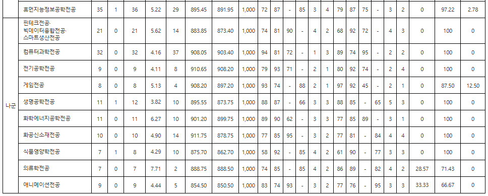 주요 학과 대학자체 환산점수 70% 입결입니다. 수학교육과 913.9, 전기공학 908.2, 컴퓨터과학 903.4, IT자유전공 902.5, 화학에너지공학 899.75, 게임전공 897.2, 이공계자유전공 894.45, 의류학 888.5, 화공신소재 878.75, 생명공학 873.75, 경영학부 852, 글로벌경영 848.5, 경제금융 848.5, 공간환경 848, 지적재산권 847, 인문사회자유전공 847.5, 교육학과 846.8, 국어교육 846, 행정학부 845, 문헌정보 844, 휴먼지능정보 891.95, 의류학 888.5, 식품영양 862.7, 핀테크·빅데이터·스마트생산 873.4, 애니메이션 850.5, 예체능자유전공 845.5입니다.
