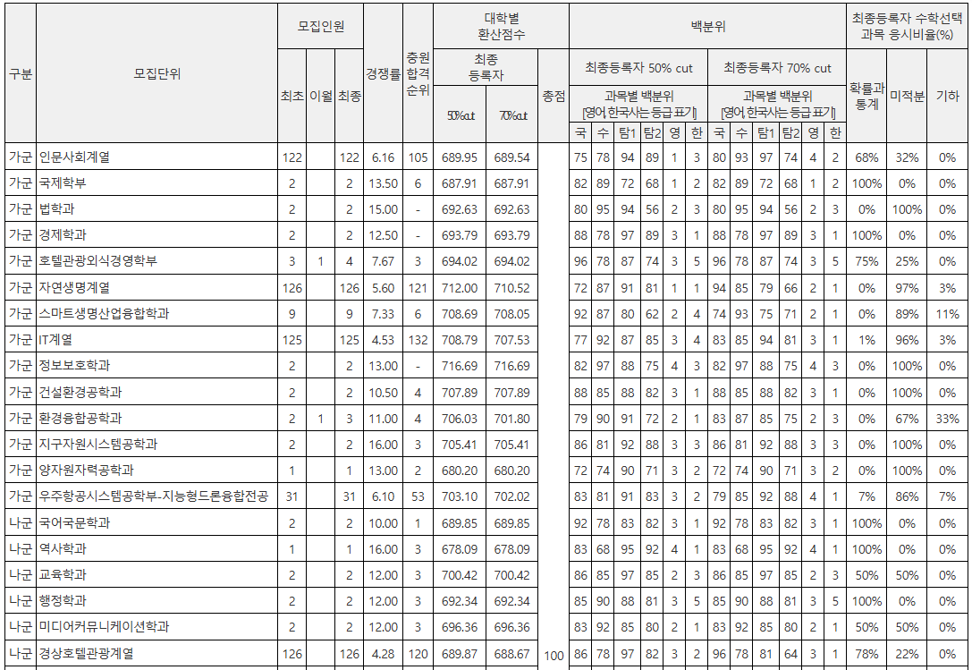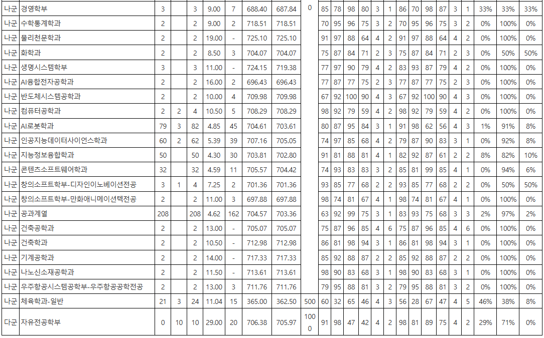 주요 학과 대학자체 환산점수 70% 컷입니다. 인문계열의 최종등록자 평균 표준점수는 약 691점입니다. 상위 학과들은 대부분 690점대를 형성했습니다. 호텔관광외식경영학부 694.02, 다음으로 미디어커뮤니케이션학과 696.36, 경제학과 693.79, 법학과 692.63, 행정학과 692.34 순으로 나타났습니다. 이어 인문사회계열 689.54, 경영학부 687.84, 국제학부 687.91, 국어국문학과 689.85, 교육학과 700.42가 뒤를 이었습니다. 인문계열의 전체 평균은 표준점수 691점, 백분위 89~92 수준이며, 수학 선택 비율은 확률과통계 70%, 미적분 30%로 구성되었습니다. 영어는 1~3등급이 다수를 차지했고, 한국사는 1~2등급이 주류였습니다. 자연계열의 평균 표준점수는 약 714점으로 인문계보다 약 23점 높게 형성되었습니다. 가장 높은 학과는 물리천문학과 725.10, 다음은 생명시스템학부 719.38, 수학통계학과 718.51, 기계공학과 717.33, 정보보호학과 716.69, 나노신소재공학과 713.61, 건축학과 712.98, 자연생명계열 710.52, 반도체시스템공학과 709.98, 컴퓨터공학과 708.29 순이었습니다. 자연계열 전체 평균은 표준점수 714점, 백분위 92~95 수준이며, 수학 선택 비율은 미적분 95%, 기하 3%, 확률과통계 2%였습니다. 영어는 대부분 1~2등급, 한국사는 1등급이 많았습니다.