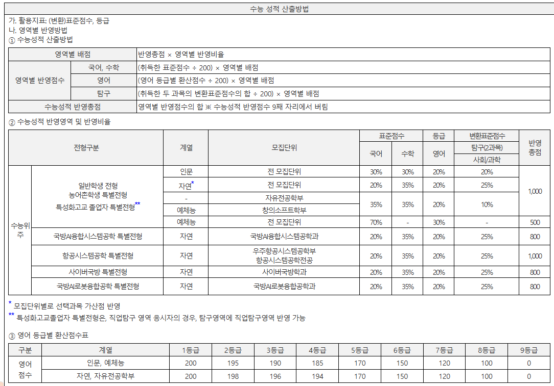 2026학년도 세종대학교 정시모집은 수능 100% 전형 중심으로 운영되는 전형입니다. 인문·자연·창의소프트학부는 수능 성적만으로 선발하며, 예체능계열(회화·패션디자인·음악·체육·무용·영화예술학과)은 **수능 50% + 실기 30% + 학생부 20%**를 반영합니다. 국방계열(해군·해병대·공군·육군)은 1단계 수능 100% 후 2단계 면접 및 체력검정 20%를 합산하는 다단계 전형으로 진행됩니다. 수능 성적은 표준점수 기준으로 반영하며, 탐구영역은 2과목 중 상위 1과목만 반영합니다. 인문계열은 국어 35%, 수학(확률과 통계) 30%, 영어 20%, 탐구 15%를 반영하고, 자연계열은 국어 25%, 수학(미적분·기하) 35%, 영어 20%, 과탐 20%의 비율로 산출합니다. 또한 수학(미적·기하) 선택자는 10%, 과탐 응시자는 5~10%의 가산점을 부여받습니다. 영어영역은 1등급 100점, 2등급 98점, 3등급 95점, 4등급 90점으로 등급별 차등 점수로 환산되며, 한국사는 필수 응시 과목으로 감점 방식이 적용됩니다. 모집군은 가·나·다군으로 구분되며, 일반학생전형은 871명, 자유전공학부 40명, 예체능계열 93명, 특성화고교졸업자 38명, 농어촌특별전형 101명을 선발합니다. 원서접수는 2025년 12월 29일부터 31일까지이며, 1단계 합격자 발표는 2026년 1월 5일, 면접 및 체력검정은 1월 10일 전후, 최종 합격자는 1월 20일경 발표 예정입니다. 모든 전형은 세종대학교 입학처 홈페이지를 통한 인터넷 접수만 가능합니다.