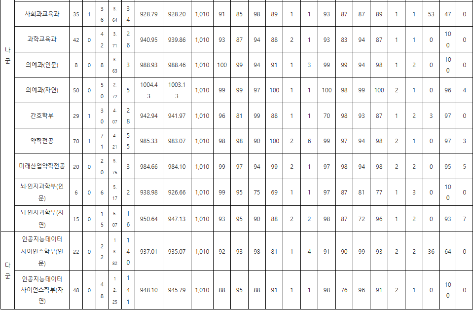 계열별 주요 학과 최종등록자 국수탐 백분위 70%컷입니다. 인문계열 의예과(인문), 98.0, 계열별통합(인문), 86.0,국어교육과, 88.3,영어교육과, 86.7,사회과교육과, 89.0,교육공학과, 90.7,교육학과, 89.3,유아교육과, 83.3, 자연계열 의예과(자연), 99.2,약학전공, 97.3,미래산업약학전공, 96.9,뇌·인지과학부(자연), 88.3,인공지능데이터사이언스학부(자연), 89.2,수학교육과, 88.3,계열별통합(자연), 88.0,간호학부, 87.3,과학교육과, 89.3,지능형반도체공학전공, 88.3입니다. 대략적으로 인문계 평균 약 89.3점 (2등급 초중반), 자연계 평균 약 91.4점 (1.8등급대), 의·약학계열은 모두 97점 이상, AI·공학·사범계열은 88~90점대에 분포합니다. 상위 학과 등급컷을 보면 의예과(자연) 70%컷 점수 약 1,003점, 평균 백분위 약 99.2, 1등급 최상위권, 약학전공 / 미래산업약학 70%컷 약 983~984점, 백분위 96~97 이상으로 1등급 상위권, AI·데이터사이언스학부(자연) 70%컷 환산 945.79점, 평균 백분위 약 89.2 2등급 영역 상단입니다. 교직·사범계열 (국어교육, 영어교육, 수학교육 등) 평균 백분위는 88~90선으로 2등급 중상권입니다. 인문 통합선발 및 교육학과 등은 평균 백분위 86~89대로 2등급 중 ~ 3등급초반 경계입니다.