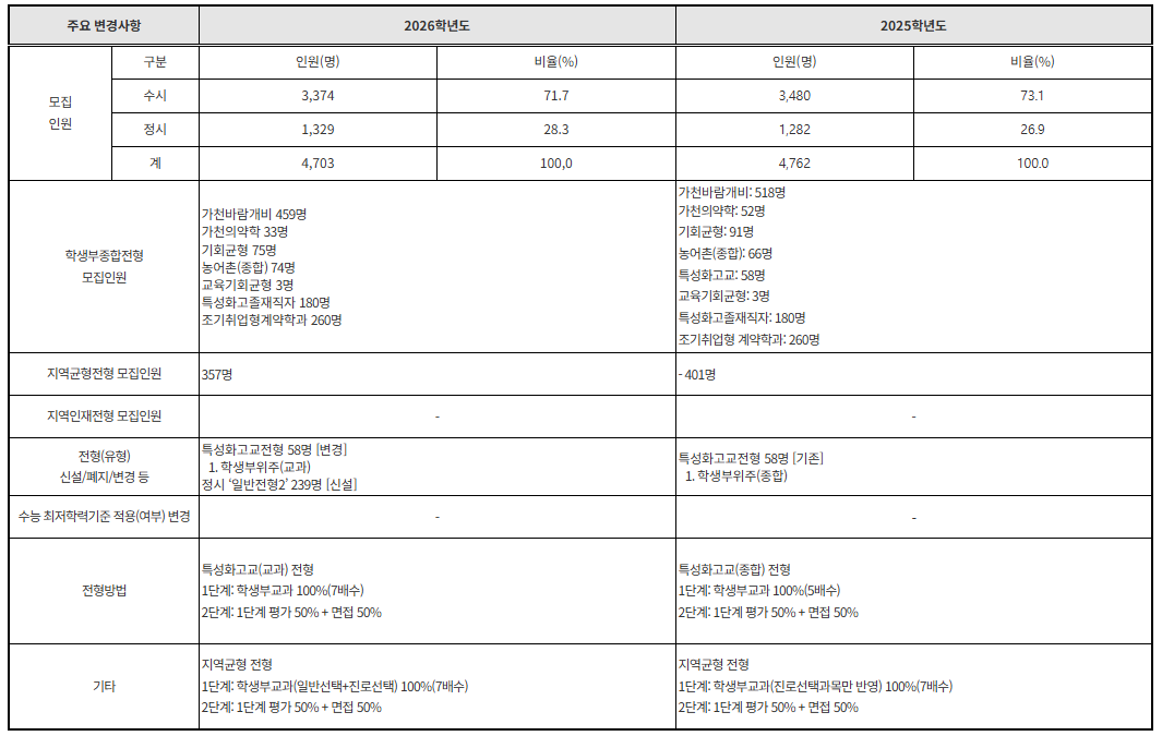 2026학년도 수시모집이 본격적으로 다가오면서 수도권 주요 대학들의 전형 정보와 합격선에 대한 관심이 커지고 있습니다. 그중 인천대학교, 가천대학교, 경기대학교는 교과등급 2.5~3.5이내내 수험생들이 지원하는 수도권 대학으로, 모집 인원과 전형 방식, 수시 등급컷을 꼼꼼히 확인하는 것이 중요합니다. 세 대학의 전형 요약과 함께 지원 전략 포인트를 정리해 보겠습니다.
