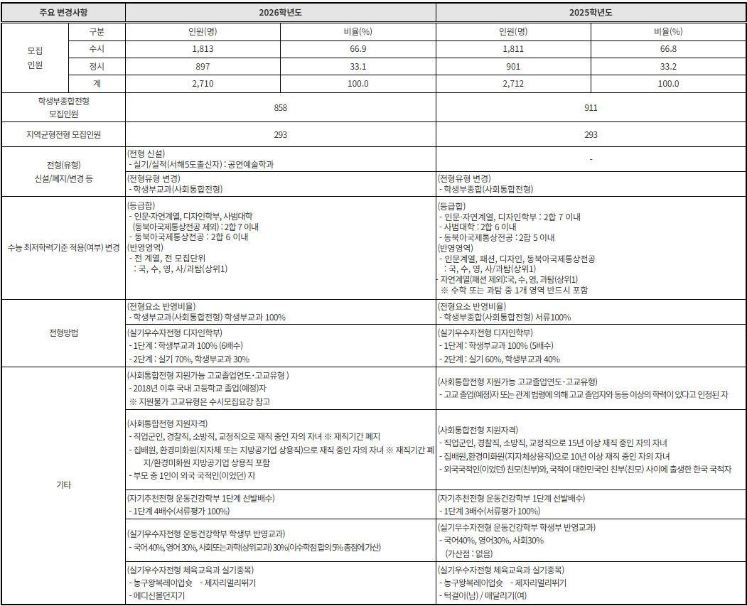 전형일정은 원서접수 2025. 9. 8.(월) 10:00 ~ 9. 12.(금) 18:00 (인터넷 접수만 가능), 서류제출 마감 2025. 9. 16.(화) 18:00 (우체국 소인 인정), 1단계 합격자 발표: 2025. 10. 2.(목) (실기우수자 전형), 실기/면접고사 2025. 10월~11월 전형별 시행, 최초합격자 발표 2025. 12. 12.(금)입니다. 수시모집 인원은 1,758명 (69.8%)이며,전형별 모집인원(수시)은 학생부교과 456명,학생부종합 348명, 실기/실적 150명입니다. 주요 변경사항으로로 학교폭력 조치사항 반영 강화되어 처분 수준에 따라 감점 또는 부적격 처리되며, 일부 학과(디자인학부, 동북아국제통상, 체육교육과 등) 증감 조정이 있습니다. 수능 최저기준 완화되어 인문·자연·디자인: 2개 영역 합 7 이내 (동북아국제통상은 6) 원서접수비(전형료)는 40,000원(수시 공통 기준), 1단계 불합격자는 2단계 전형료 일부 반환 제도 운영합니다.