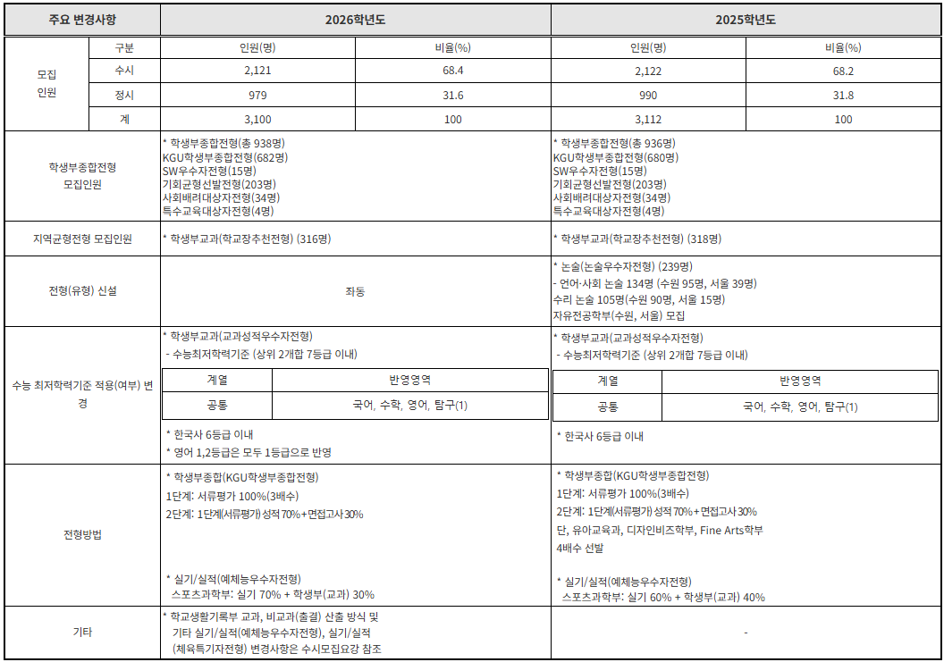 전형일정은 원서접수 2025. 9. 8.(월) ~ 9. 12.(금) 17:00 (온라인 접수),논술고사 2025. 11. 21.(금) (수원캠퍼스), 합격자 발표 1차 2025. 11. 14.(금), 최종 2025. 12. 12.(금)입니다. 수시모집 인원은 학생부교과(교과성적우수자) 275명, 학생부교과(학교장추천) 316명,학생부종합(KGU) 682명, 학생부종합(SW우수자) 15명,학생부종합(기회균형) 203명, 학생부종합(사회배려대상자) 34명,논술우수자 239명입니다. 입학정원 축소로 2,946명 → 2,936명 (10명 감소), 교과성적우수자·학교장추천 전형 인원이 일부 축소됩니다. 학교생활기록부 산출방식은 평균석차등급 → 평균점수제로 변경됩니다. 수능 최저학력기준은 학생부교과(교과성적우수자 전형),국어·수학·영어·탐구 중 2개 합 7 이내이며, 학교장추천, 농어촌, 기초생활수급자, 종합전형, 실기/실적 전형은 수능최저기준이 없습니다. 논술우수자 전형은 국·수·영·탐 중 2개 합 6 이내 (한국사 필수 반영)입니다. 원서접수비(전형료)는 60,000원 (공통 기준)입니다.