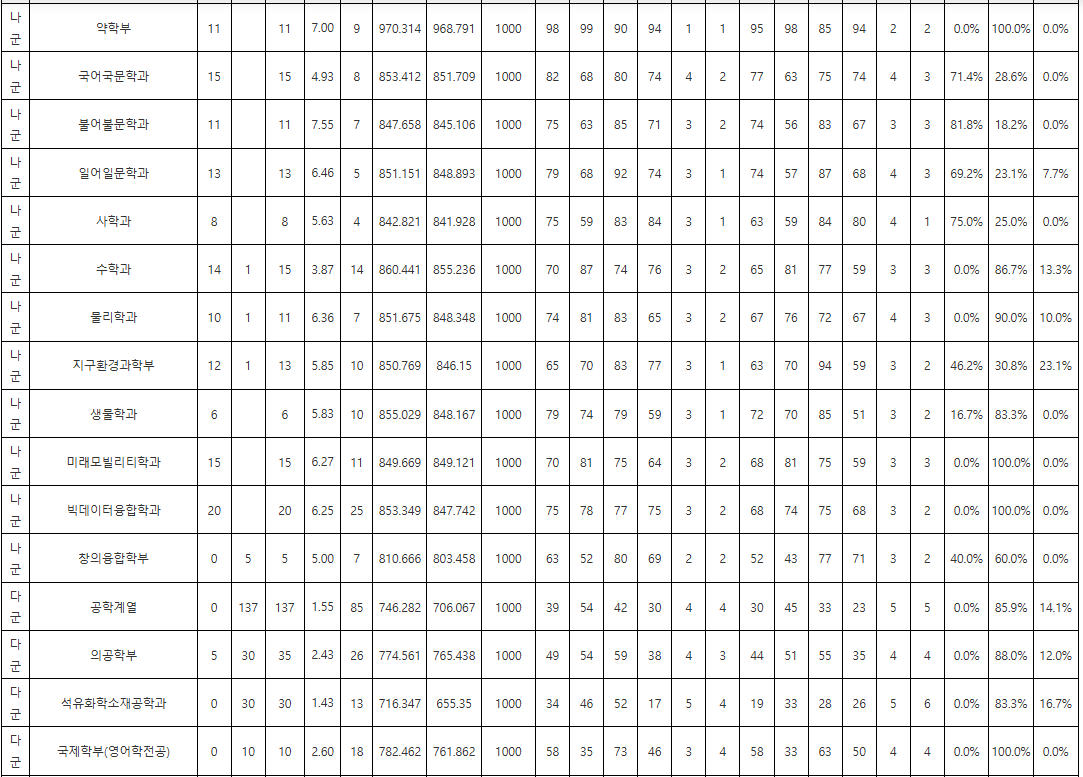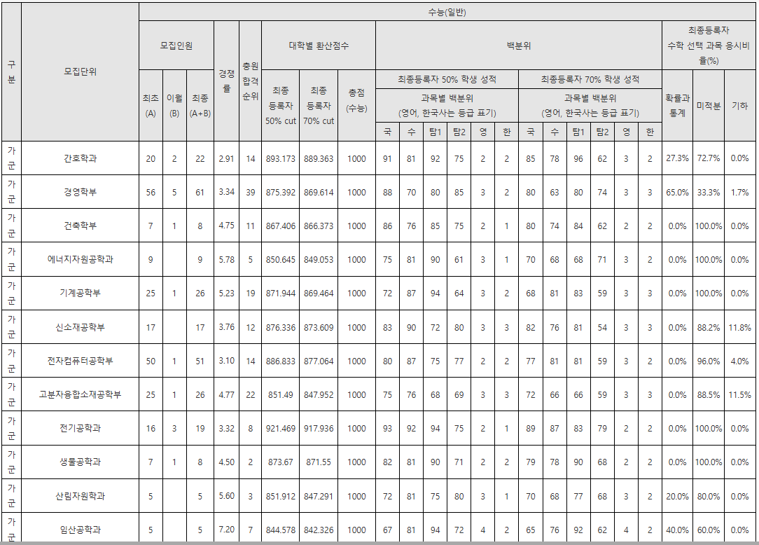 인문계는 사범대 강세로 상위권 컷이 높게 형성되므로 국어·탐구 조합이 안정적인 학생에게 유리하고, 자연계는 공학계열 경쟁이 넓게 분산되어 수학·과탐의 균형이 가장 중요합니다. 또한 동일 점수대라 하더라도 학과별로 국어·수학·탐구 반영비율이 다르기 때문에, 자신의 강점 과목이 더 크게 반영되는 학과를 선택하는 것이 합격 가능성을 높이는 핵심 팁입니다. 군별 지원 전략 또한 중요한데, 가군·나군 중 복수 학과를 고려하는 학생은 전년도 경쟁률과 합격선을 반드시 비교해야 하며, 다군은 모집인원이 적어 변동폭이 크므로 안정 지원보다 ‘막판 역전’ 전략에 적합합니다. 무엇보다 자신의 백분위 조합, 수학 선택과목, 탐구 조합을 기반으로 학과 특성과 반영비율을 세밀하게 대조하는 것이 성공적인 전남대 정시 지원의 핵심입니다.