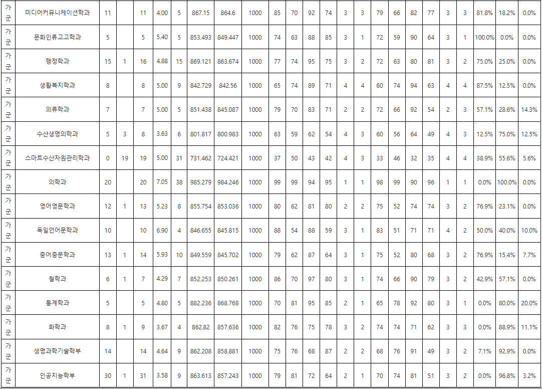 주요 학과 국수탐 백분위 70%컷입니다. 심리학과 78.67, 문헌정보학과 78.33, 경제학부 75.00, 정치외교학과 75.00, 철학과 74.83, 농업경제학과 74.17, 경영학부 73.33, 행정학과 71.83, 사회학과 71.67, 국어국문학과 71.50, 전기공학과 85.67, 자율전공학부(1년) 81.67, 생물공학과 78.67, 심리학과 78.67, 문헌정보학과 78.33, 산업공학과 78.00, 분자생명공학과 77.50,통계학과 76.33, 전자컴퓨터공학부 76.00, 토목공학과 75.83, 의학과 96.67, 약학부 94.67, 수의예과 93.17, 간호학과 80.67, 수학교육과 80.00, 윤리교육과 76.83, 국어교육과 76.50, 지리교육과 76.50, 유아교육과 76.33, 지구과학교육과 76.00입니다. 인문계 평균 백분위 71.62, 자연계 69.19, 전체 평균 69.89입니다.