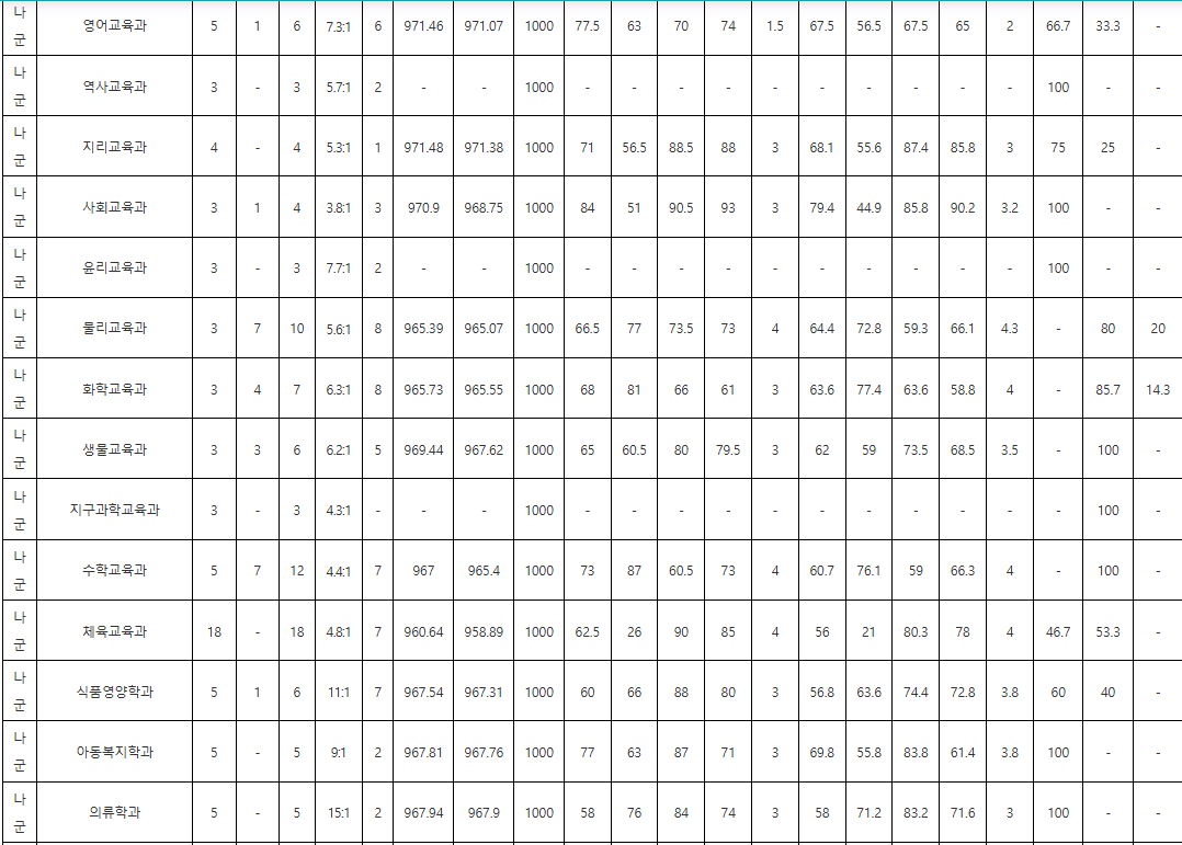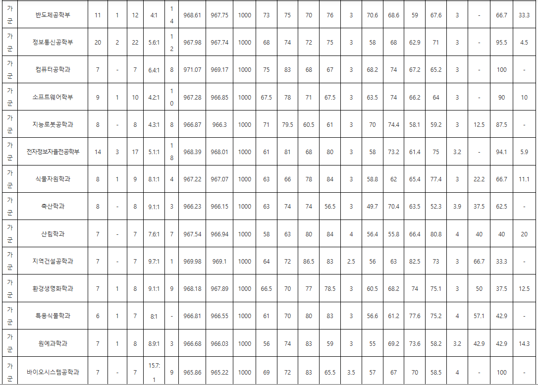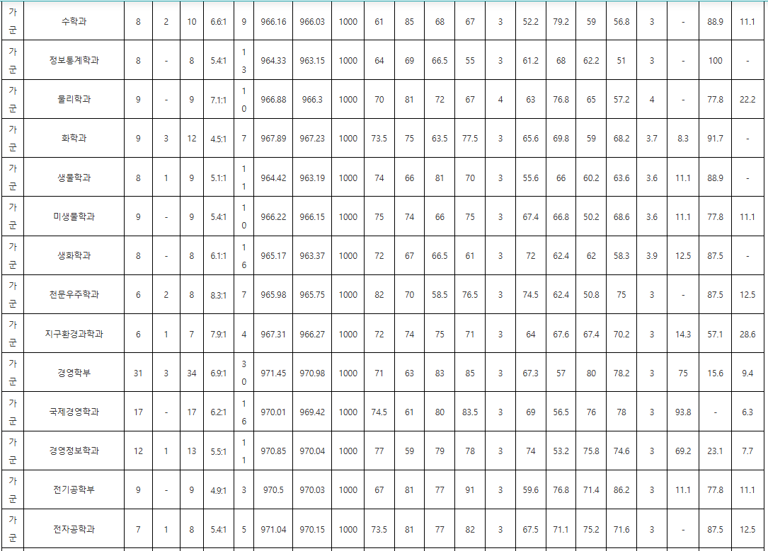 주요 학과 국수탐 백분위 70%컷입니다. 의예과(나군) 95.95, 의예과(가군) 94.30, 수의예과 94.30, 지리교육과 74.23, 사회교육과 74.08, 국어교육과 71.92, 물리교육과 64.97, 수학교육과 63.45, 간호학과 74.33, 지리교육과 74.23, 전기공학부 74.65, 전자공학과 71.35, 반도체공학부 67.63, 화학공학과 69.97, 신소재공학과 69.20, 지구환경과학과 67.33, 사회학과 72.67, 정치외교학과 73.45, 경제학과 71.88, 심리학과 70.75, 행정학과 70.90, 국어국문학과 69.55, 영어영문학과 68.55, 독일언어문화학과 69.12, 프랑스언어문화학과 68.38, 러시아언어문화학과 68.88입니다. 계열별 평균을 보면 인문계열 69.59, 자연계열 68.49, 전체적으로는 68.79대입니다.