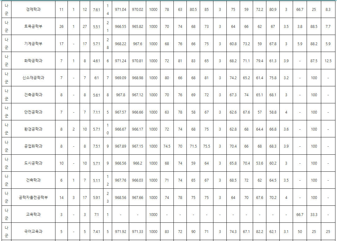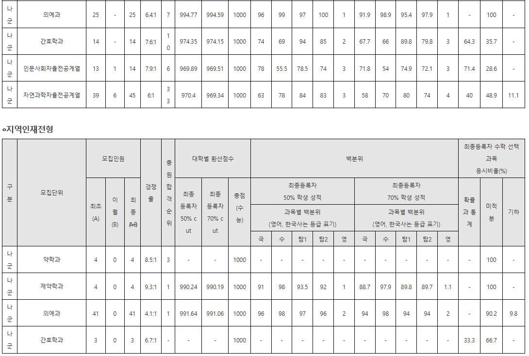 충북대학교 2025학년도 정시 최종등록자 성적을 분석해보면, 계열별 경쟁 구조와 학과별 성취도 차이가 분명하게 나타납니다. 인문계열은 평균 69점대, 중위값 역시 69점대 초반으로 분포가 비교적 안정적이며, 학과 간 점수 편차가 크지 않은 것이 특징입니다. 반면 자연계열은 의예과·수의예과·간호학과 등 상위권 학과가 평균을 끌어올려 전체 평균은 68점대 후반이지만, 중위값은 67점대로 낮아 상위 학과와 일반 자연계 학과 간 격차가 뚜렷합니다. 전체 학과 기준으로는 평균 68.79, 중위값 67.68로 자연계열 영향이 크게 작용하고 있습니다. 이러한 분포는 충북대 정시가 전형적으로 상위권 의학·공학 중심 경쟁을 보이면서도 인문계는 안정적인 지원 흐름을 유지하는 구조임을 보여줍니다.