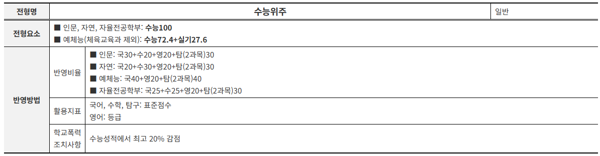 충북대학교 2026학년도 정시모집은 가·나·다군에서 총 682명을 선발하며, 인문·자연계열 대부분은 수능 100% 일괄합산 전형으로 진행됩니다. 예체능 모집단위는 실기 비중이 포함되는데, 미술학과·디자인학과는 수능 500점과 실기 500점을 합산하고, 체육교육과는 수능 650점과 실기 350점을 합산해 총점 1,000점 체제로 운영됩니다. 모든 모집단위는 국어·수학·영어·탐구·한국사 전 영역을 응시해야 하며, 탐구는 2과목을 필수로 반영하고 한국사는 총점 산출에는 포함되지 않습니다. 모집단위별 반영 영역 규정은 비교적 명확합니다. 인문계열은 국어·수학 선택과목·영어·탐구 등 모든 영역을 반영하며, 자연계열의 경우 일부 모집단위에서 수학 선택과목 제한이 적용됩니다. 수학과·정보통계학과·수학교육과·약학과·제약학과·의예과는 확률과통계를 인정하지 않아 미적분 또는 기하를 선택해야 합니다. 자연과학대학 대부분의 학과, 공과대학, 간호대학, 생활과학대학 등은 수학 선택에 제한이 없으며 탐구는 지정과목 없이 응시한 과목 중에서 반영합니다. 수능 성적 활용 방식은 일반적인 정시 전형의 구조를 따르며, 대학은 영역별 성적을 합산해 총점을 산출합니다. 영어는 등급을 활용해 반영하지만, 1~4등급 점수표는 요강에 별도로 제시되어 있지 않습니다. 탐구 영역은 2과목을 반영하고, 실제 계산은 대학 기준에 따라 반영점수로 환산해 활용합니다. 한국사는 필수 응시이나 총점에 포함되지 않아 지원자 부담을 낮추는 구조입니다. 정시 선발 인원은 가군 365명, 나군 264명, 다군 53명이며, 이는 수시 미충원 결과에 따라 일부 변동될 수 있습니다.