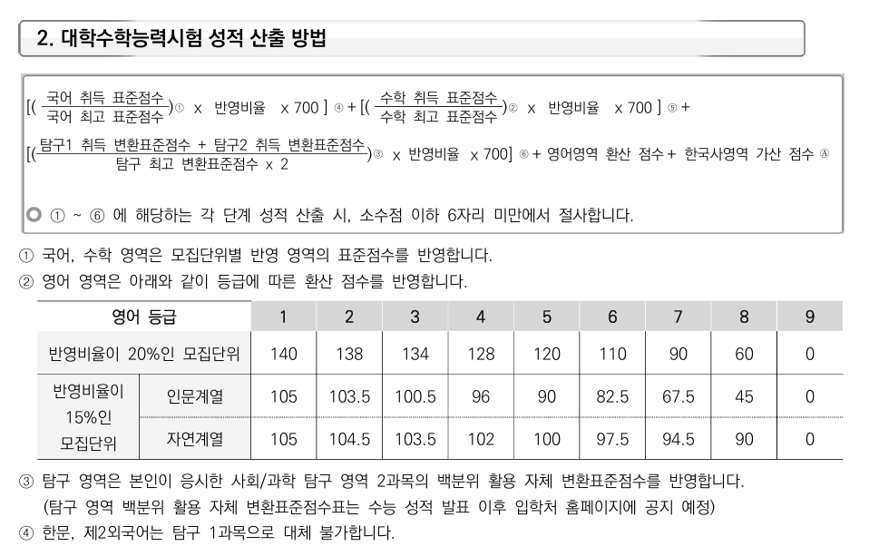 2026학년도 한국외국어대학교 글로벌캠퍼스 정시모집은 수능 100% 전형으로 진행되며, 총점 700점 만점 기준으로 성적을 산출합니다. 학생부는 반영되지 않으며, 영어 절대평가와 한국사 감점 규정은 서울캠퍼스와 동일하게 적용됩니다. 글로벌캠퍼스는 다양한 언어·융합·자연과학·공학 계열을 포함하며, 정시는 수능 성적만으로 선발하는 매우 명확한 구조입니다. 글로벌캠퍼스 정시 일반전형 모집인원은 가·나·다군 전체에서 총 694명을 선발합니다. 군별로는 가군 85명, 나군 275명, 다군 334명으로 구성되어 있으며, 특히 다군 비중이 가장 큰 것이 특징입니다. 가군에는 컴퓨터공학부, 정보통신공학과, 반도체전자공학부, 산업경영공학과 등이 포함되고, 나군에는 한국어교육과·교육학·국제금융학과 등 다수 전공이 배치됩니다. 다군에서는 인문대학 통합모집, 국가전략언어대학 전 학부, 경상대학, 자연과학대학, AI융합대학, Culture & Technology융합대학 등이 폭넓게 편성되어 많은 인원을 선발합니다. 수능 반영 비율은 모집단위에 따라 차이가 있습니다. 글로벌캠퍼스 인문계열 대부분은 국어 30%, 수학 30%, 영어 20%, 탐구 20%를 반영합니다. 국가전략언어대학, 인문대학 통합모집, C&T융합대학, 융합인재학부가 이에 해당합니다. 경상대학 및 Finance & AI융합학부는 국어 30%, 수학 35%, 영어 15%, 탐구 20%로 수학 비중이 더 높습니다. 자연·공학·AI융합 계열은 국어 20%, 수학 35%, 영어 15%, 탐구 30%를 사용하며, 자연과학대학·공과대학·AI융합대학·기후변화융합학부가 이에 포함됩니다. 영어는 절대평가 등급을 대학 환산점수로 변환하여 반영하며, 1등급 140점, 2등급 138점, 3등급 134점, 4등급 128점 등으로 차등 적용합니다. 탐구는 두 과목의 변환표준점수 평균을 반영하며, 국어·수학은 표준점수를 그대로 사용합니다. 한국사는 등급에 따라 감점 또는 가산점 방식으로 반영됩니다. 최종 총점은 700점이며, 동점자는 수학·탐구·국어·영어 순으로 우선합니다.