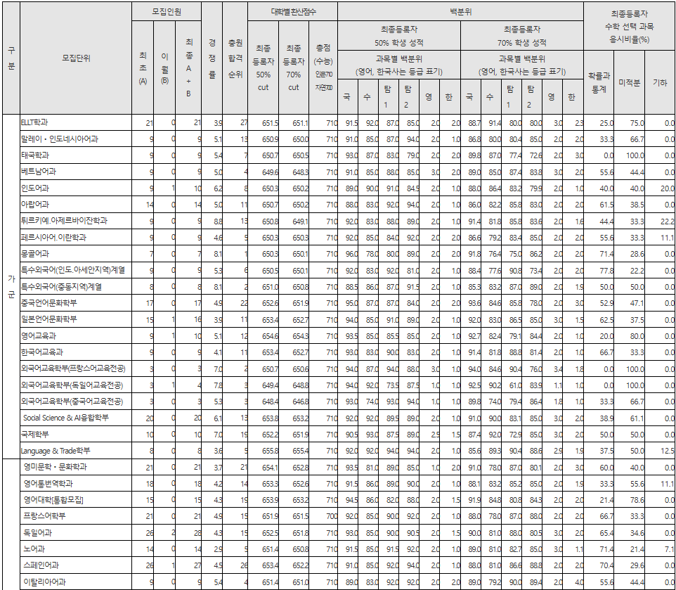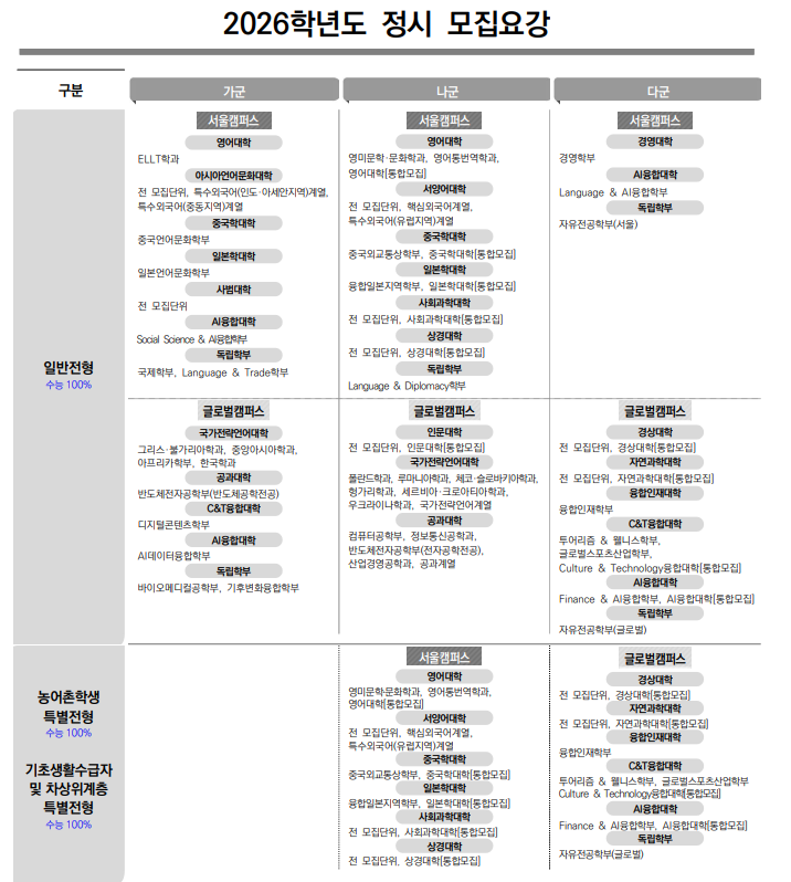 전형 요소 반영 비율은 일반전형 수능 100% (총점 700점 만점), 모집단위별 수능 영역 반영 비율 (%)은 어학계열 (영어대학, 서양어대학, 아시아언어문화대학, 중국학대학, 일본학대학, 사범대학, 자유전공학부),국어 30% (210점),수학 30% (210점),영어 20% (140점),탐구 20% (140점),사회과학·상경·경영·국제학부·ELLT학과·Social Science & AI융합학부 국어 30% (210점),수학 35% (245점),영어 15% (105점),탐구 20% (140점),자연계열 (Language & AI융합학부)국어 20% (140점),수학 35% (245점),영어 15% (105점),탐구 30% (210점)입니다. 수학은 선택과목에 따른 가산점은 없으며, 반영 비율 차등 적용합니다. 탐구는 2과목 평균 반영입니다. 영어 반영 방법 (등급별 환산 점수)은 1등급 140점,2등급 136점,3등급 132점,4등급 128점,5등급 이하부터는 4점씩 감점 적용입니다.